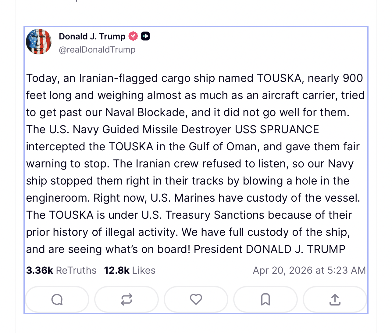 When the vessel refused, the US Navy “stopped them right in their tracks by blowing a hole in the engine room”, Trump said.