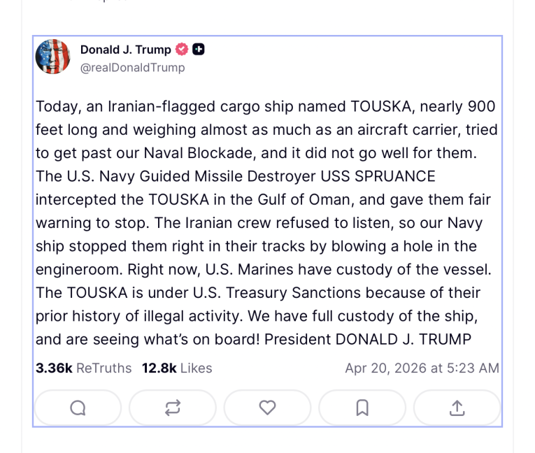 The ship was attempting to pass a US blockade of Iran’s ports and was given “fair warning to stop” in the Gulf of Oman, Trump posted on Truth Social on Monday morning (AEST).