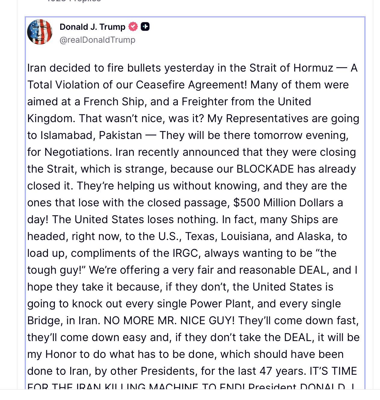 “We’re offering a very fair and reasonable DEAL, and I hope they take it because, if they don’t, the United States is going to knock out every single Power Plant, and every single Bridge, in Iran,” he posted on social media.