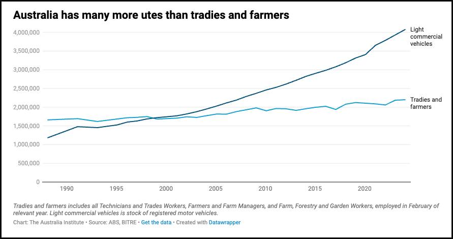 A common argument is that these ever-larger vehicles are needed by tradies and farmers for work, or by families to pull caravans and boats.