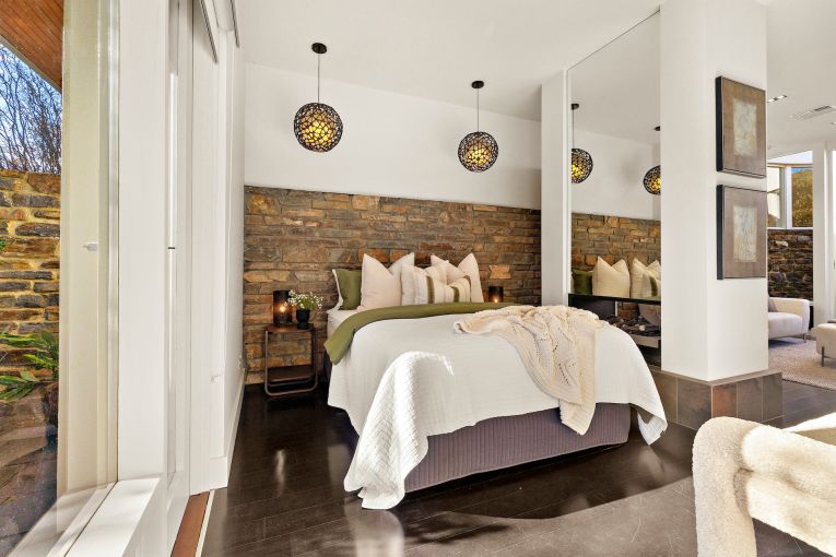 “Don looked at natural and warm things, so that’s why we’ve got the bluestone wall that starts at the front and curves around the house,” says Trevor.