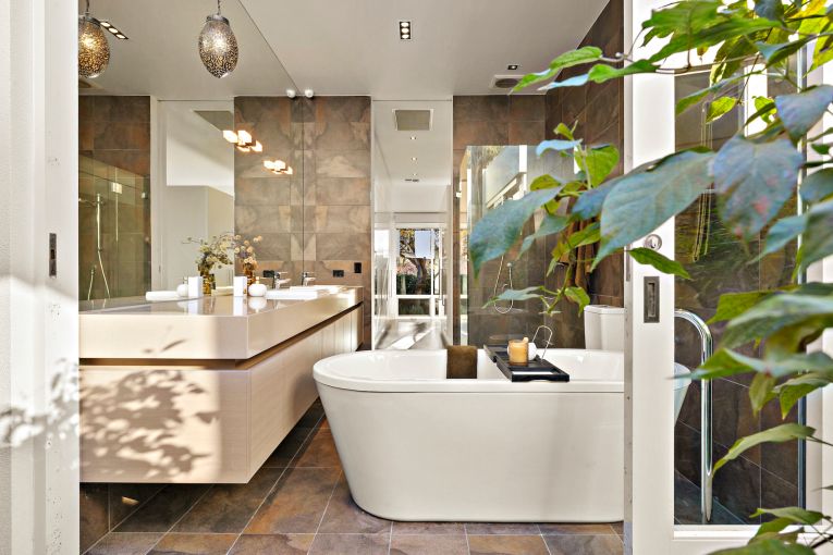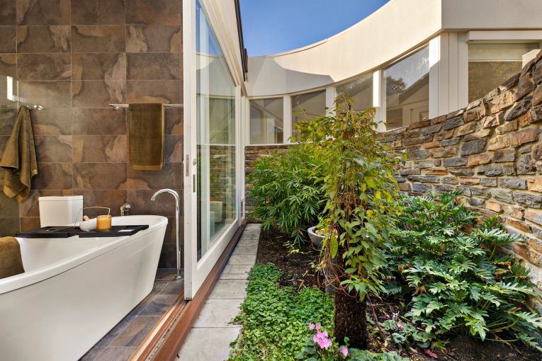 The parents’ retreat features bamboo flooring, a private courtyard with a prominent Chinese tallow tree, a spacious walk-in wardrobe, a double-sided gas fireplace and a luxurious en suite with a freestanding bath.
