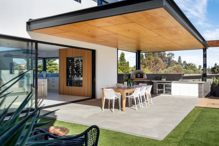 An emphasis has also been placed on natural products, such as the pizza oven with mosaic tiles, millboard for the decking, and a concrete benchtop.