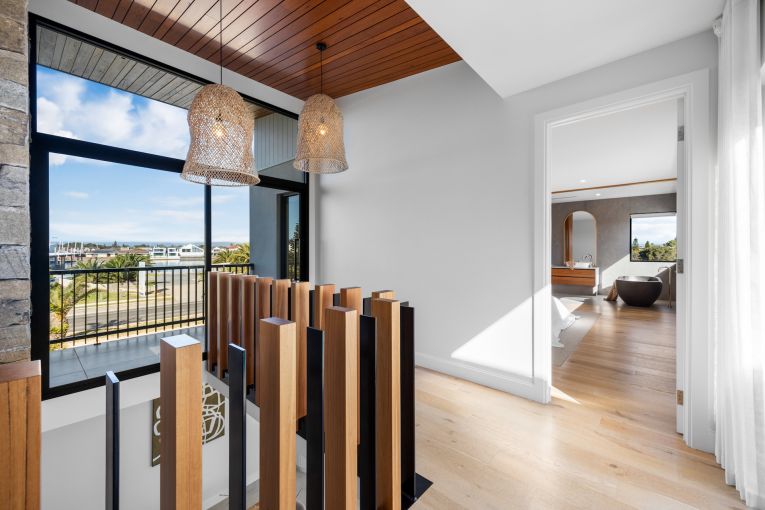 The beach theme continues throughout the dwelling, with the use of timber, whitewash floorboards and rattan light fittings for the interiors.