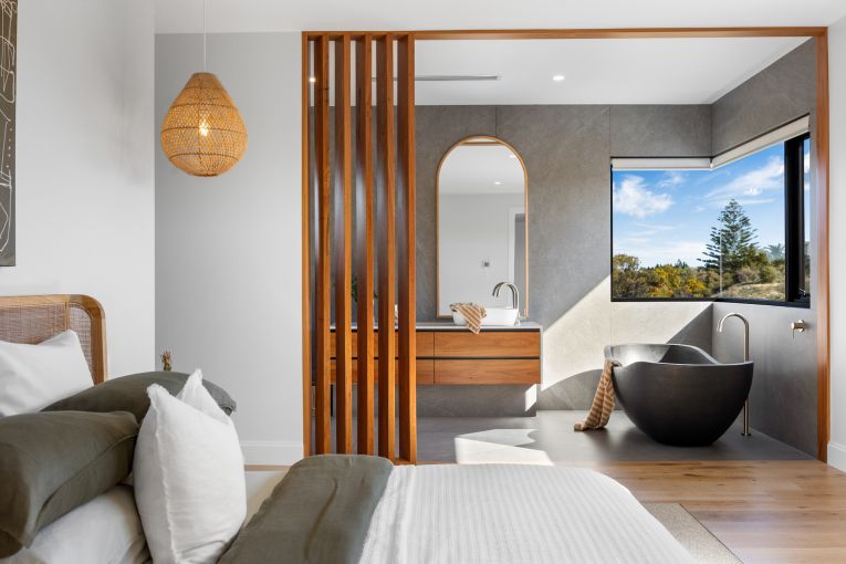 The bathrooms feature freestanding Balinese bathtubs, with the master ensuite affording postcard views of the surrounding sand dunes.