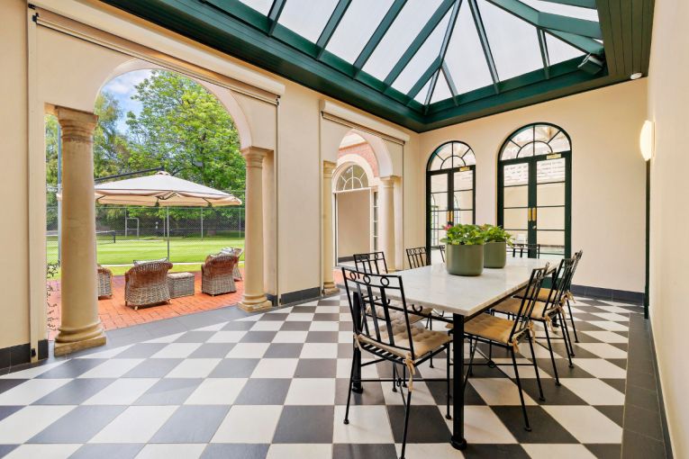This grand neoclassical home in Walkerville boasts expansive grounds of 2600 square metres with an indoor swimming pool, sauna and cinema room, as well as a tennis court that has been hosting social games for nearly 30 years.