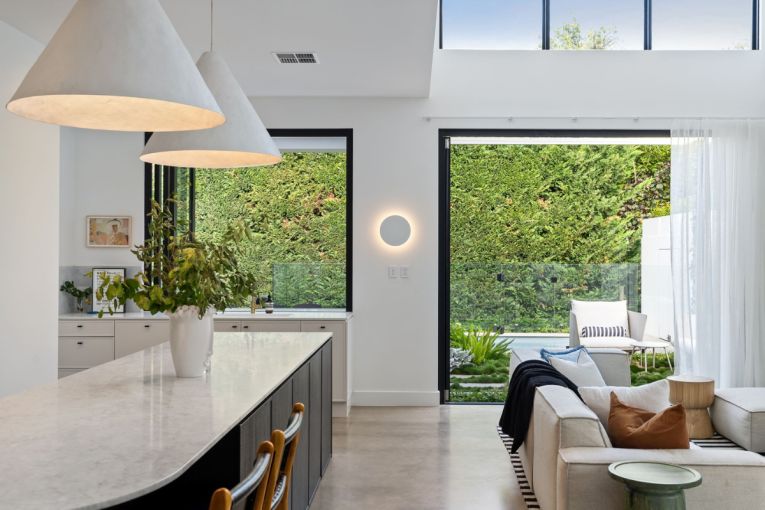 As a result, the extension is a seven-metre raked ceiling and a wall of glass that not only creates a light and bright living space, but also showcases the century-old hedge that lines the backyard.