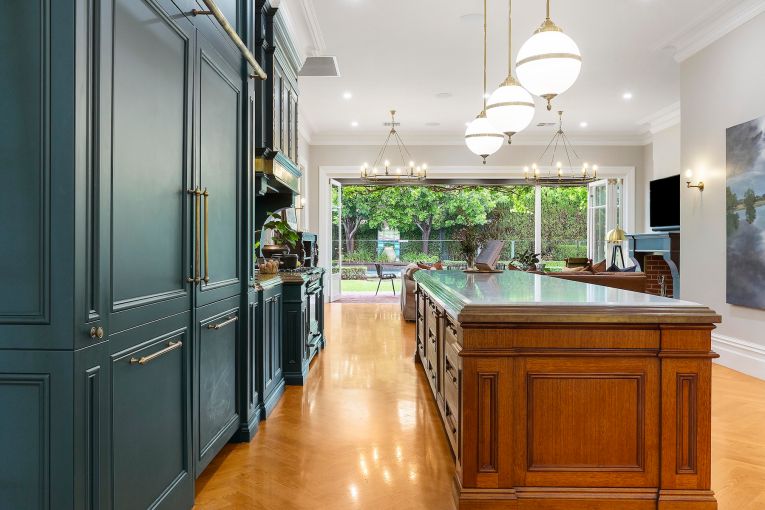 The kitchen features Carrara marble and bespoke brass fittings, matched by European appliances and a custom-made timber ladder in the butler’s pantry.