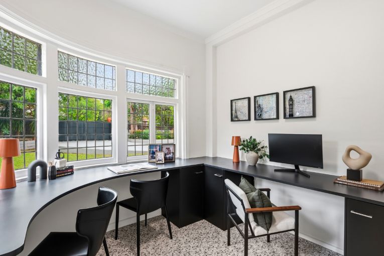 The basic, dilapidated kitchenette from its days as a church and a theatre company remained as well as a commercial bathroom with a vacant-occupied sign, which Eloise and Graham had converted into a home office and a small bar that services the formal dining room and the sunroom at the front of the house.