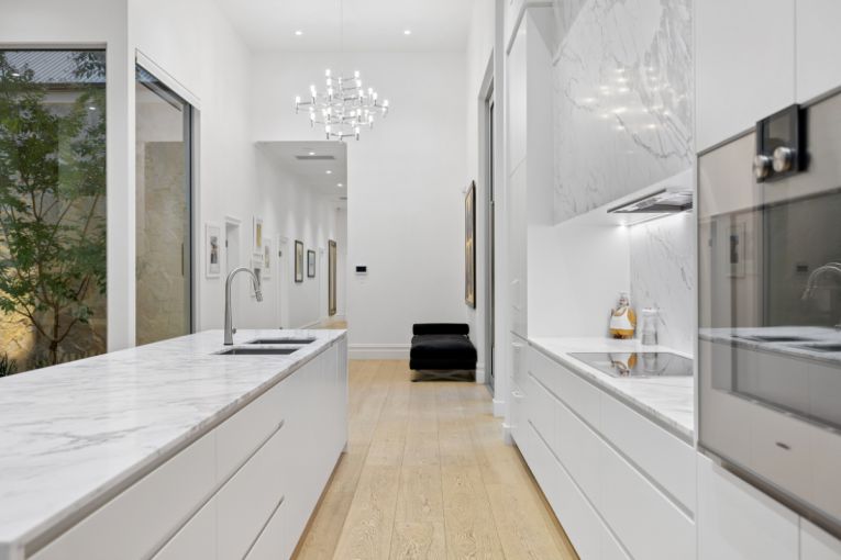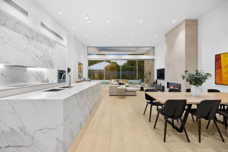 Anna says the kitchen is the centrepiece of the home, featuring a 3.5-metre-long statuario marble island bench and premium Gaggenau appliances.