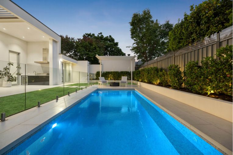 The home also features a swimming pool, outdoor dining area and solar panels with two Tesla batteries.