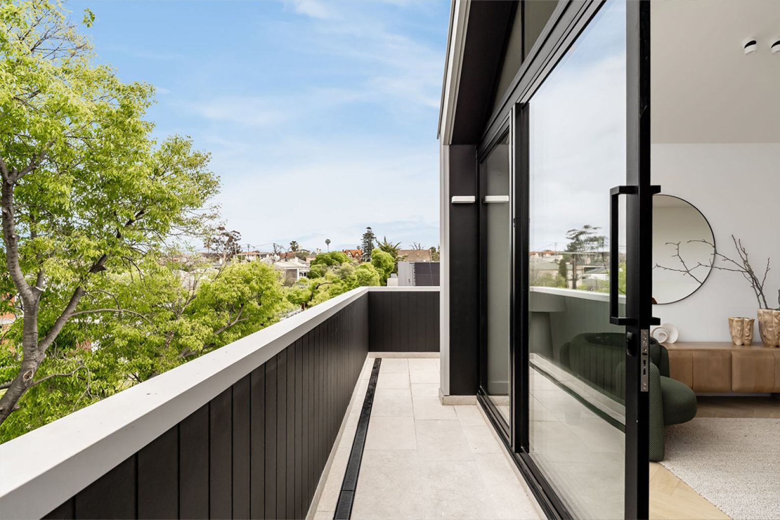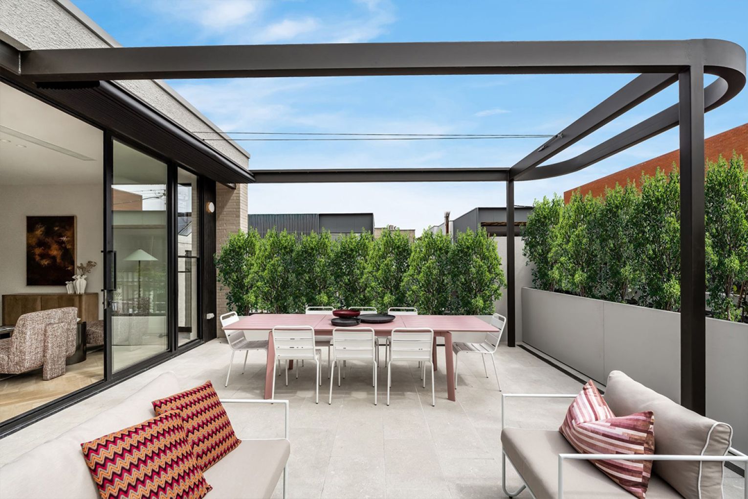 Beyond, full-height glazing retracts to reveal a stone-paved terrace bathed in northern light and protected by a motorised awning.