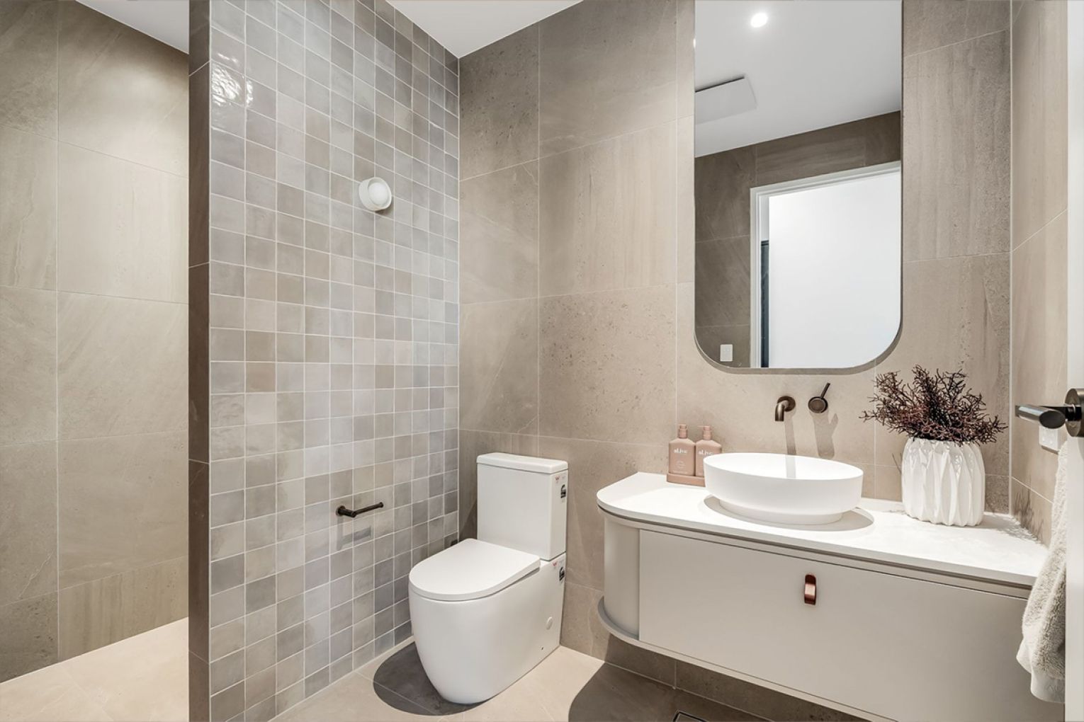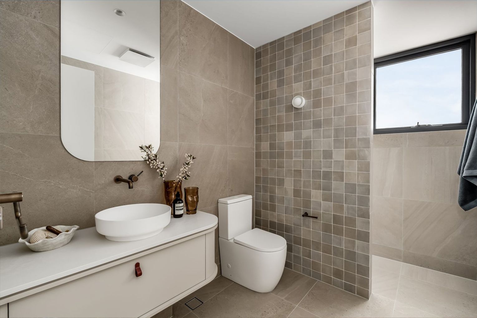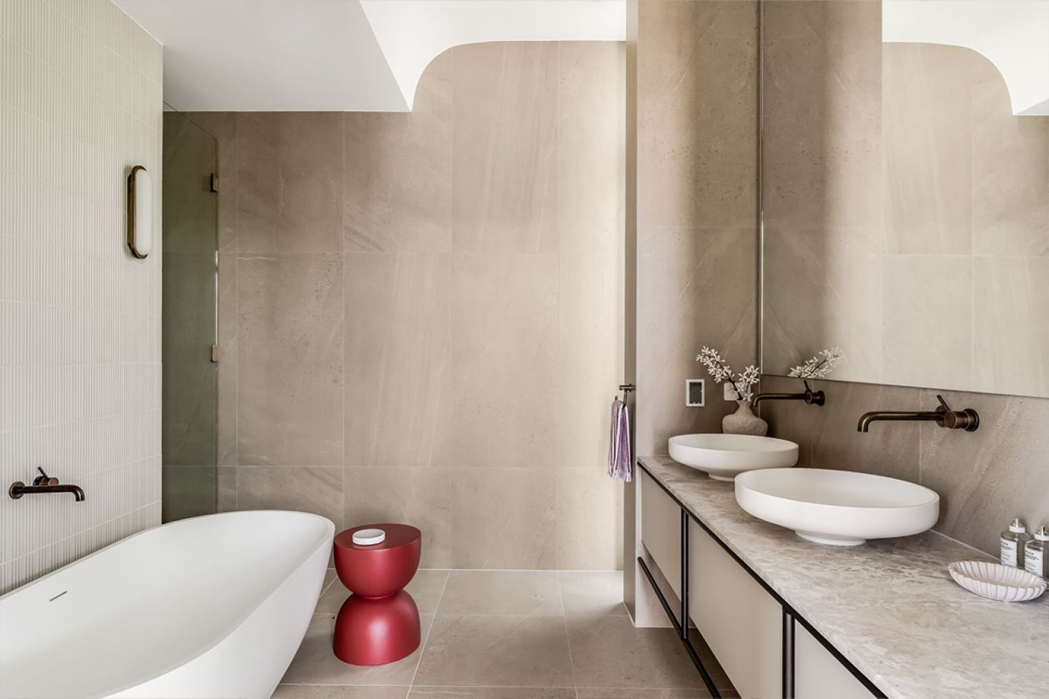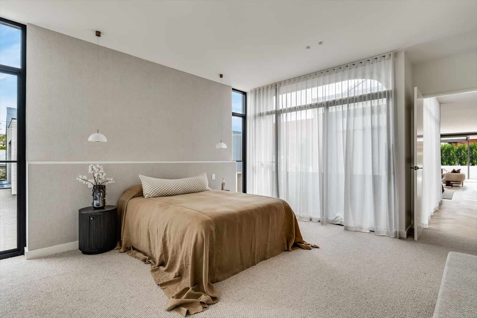 The main suite adopts the tone of a boutique hotel, complete with walk-in robe and an indulgent ensuite featuring freestanding bath, dual vanity and walk-in shower.