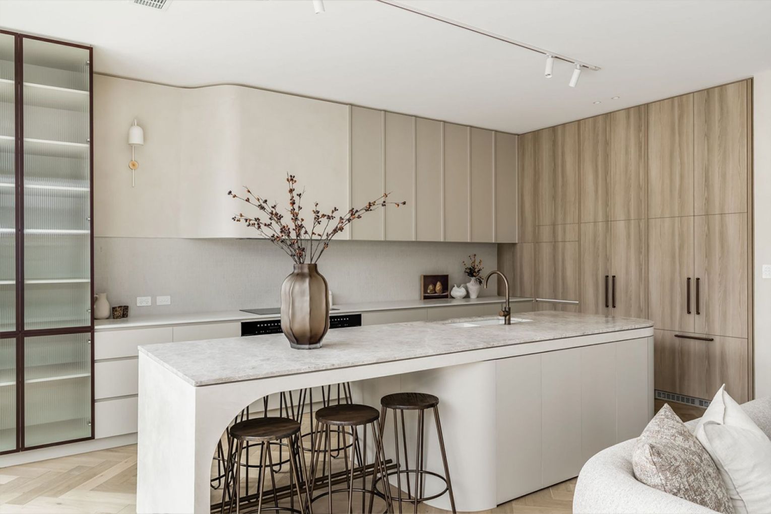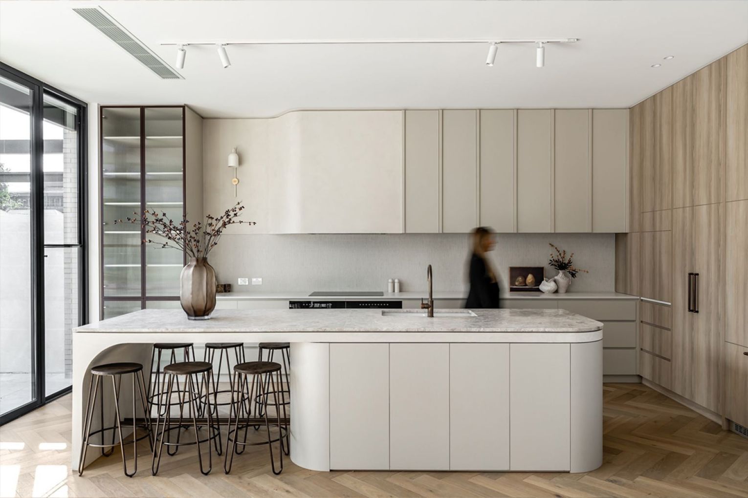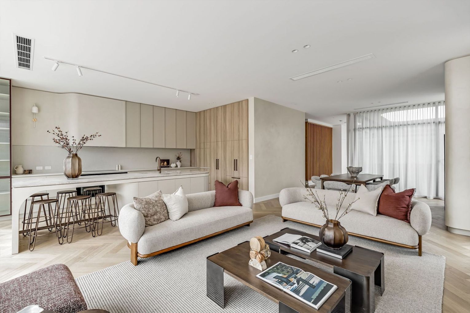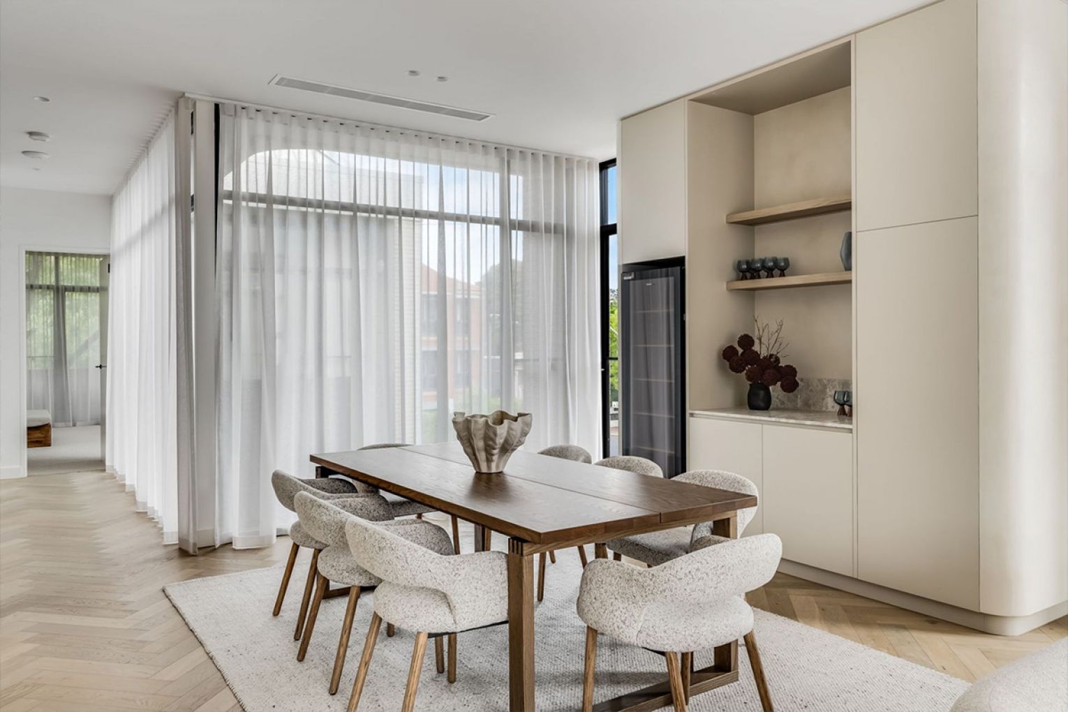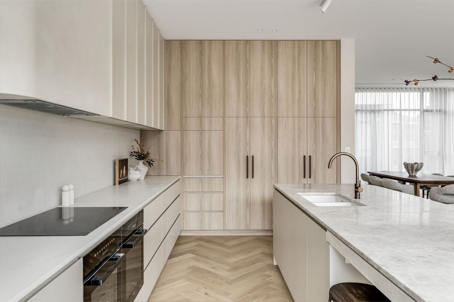 Ascend via open-tread steel stairs or your private lift to the beating heart of the home – an expansive living and dining zone defined by Venetian plaster, herringbone oak floors and a Miele-laden kitchen draped in Pietra limestone.