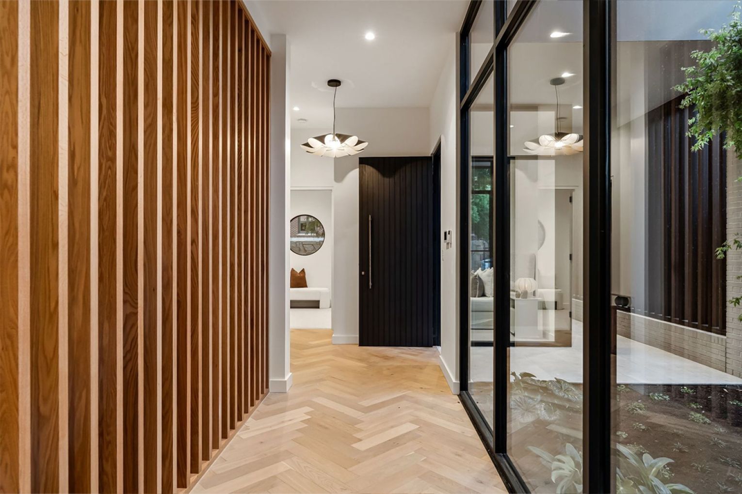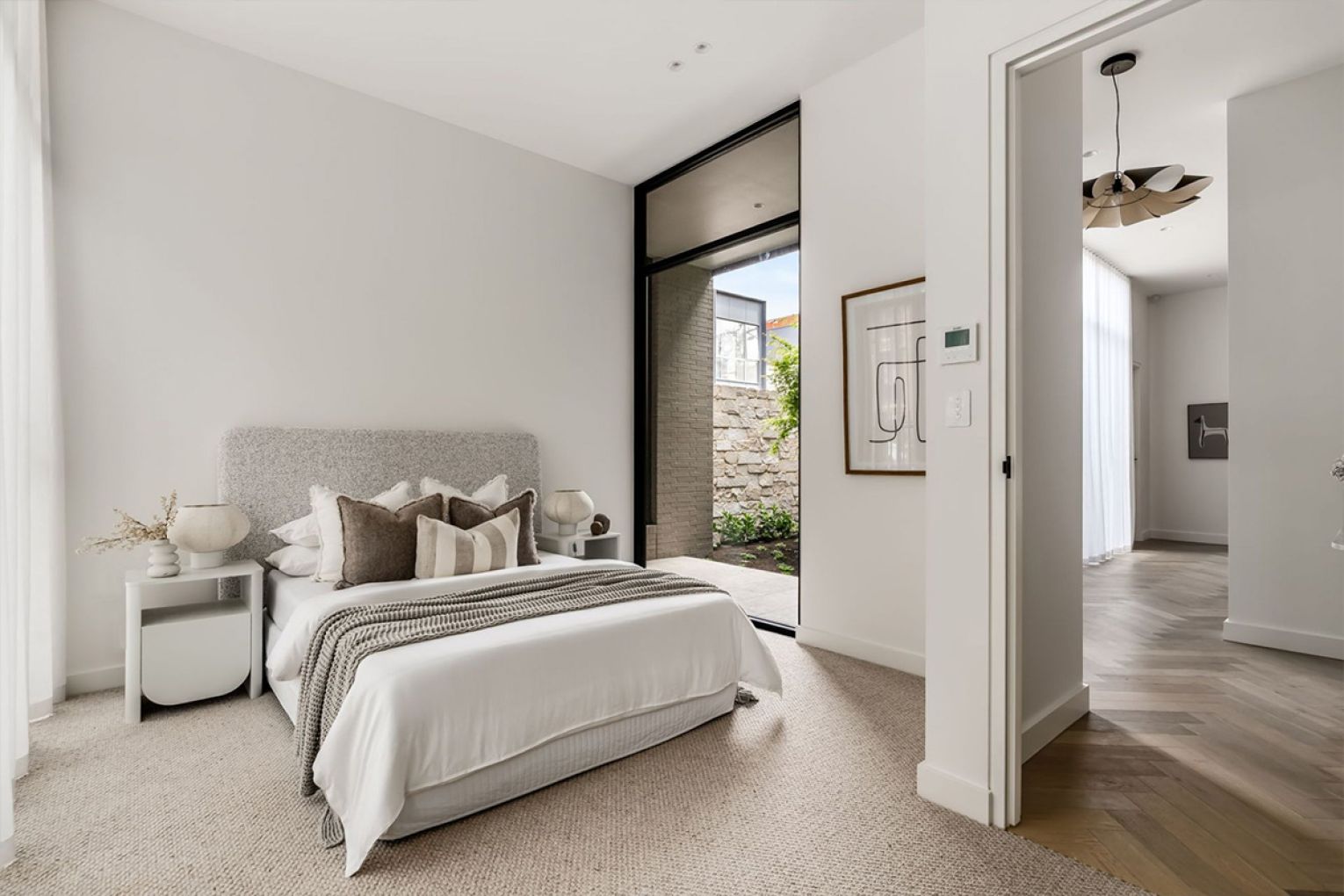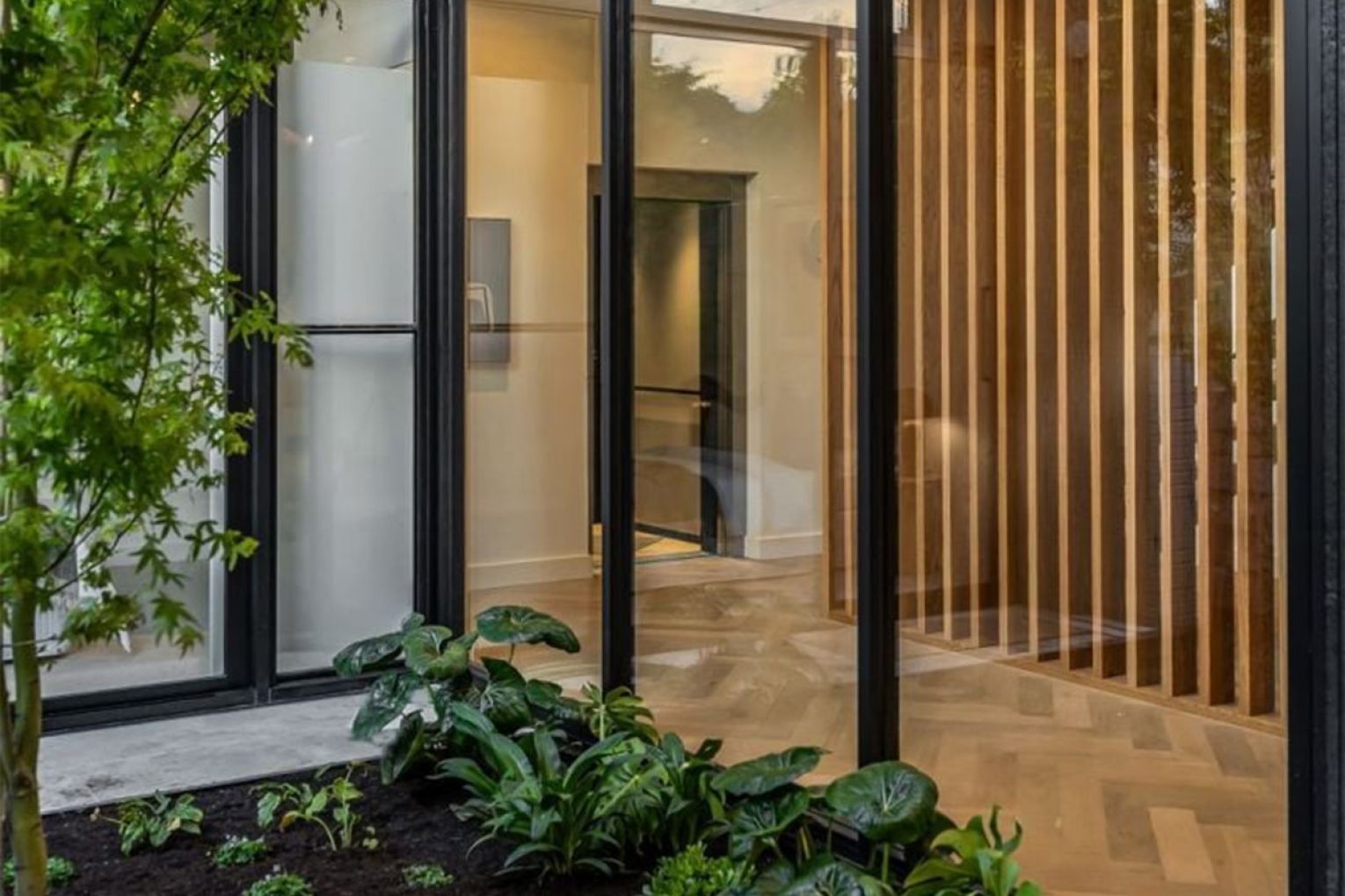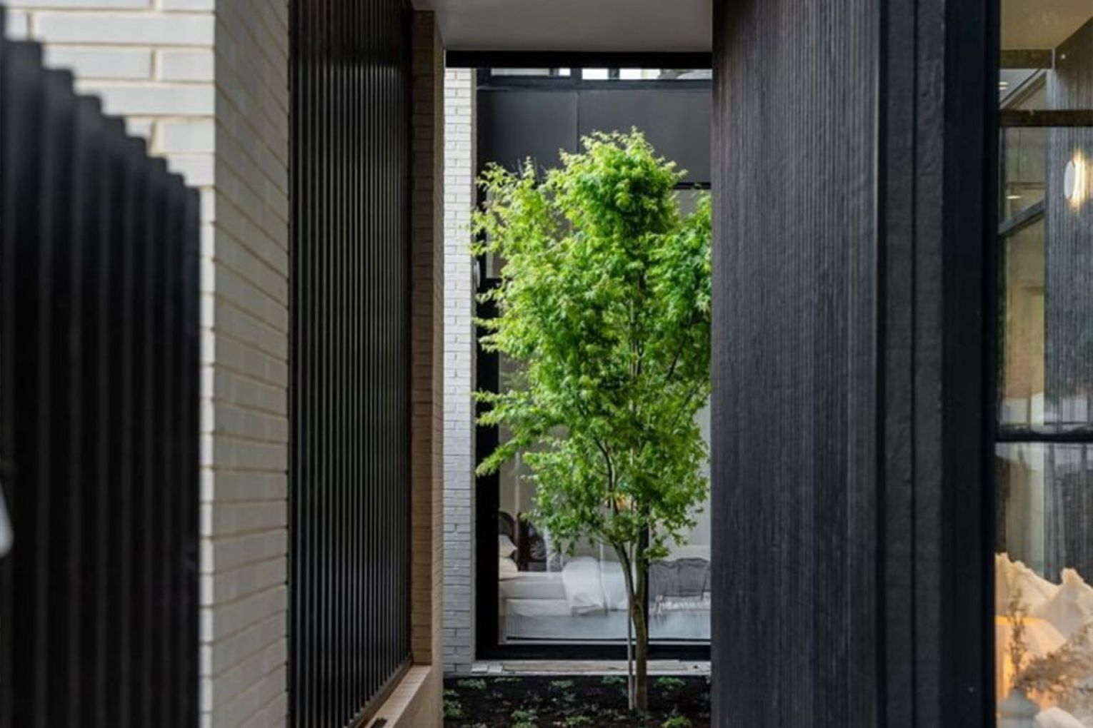 The lower level opens with a pair of serene bedrooms, arranged around a glazed light well courtyard, anchored by a solitary Japanese maple.