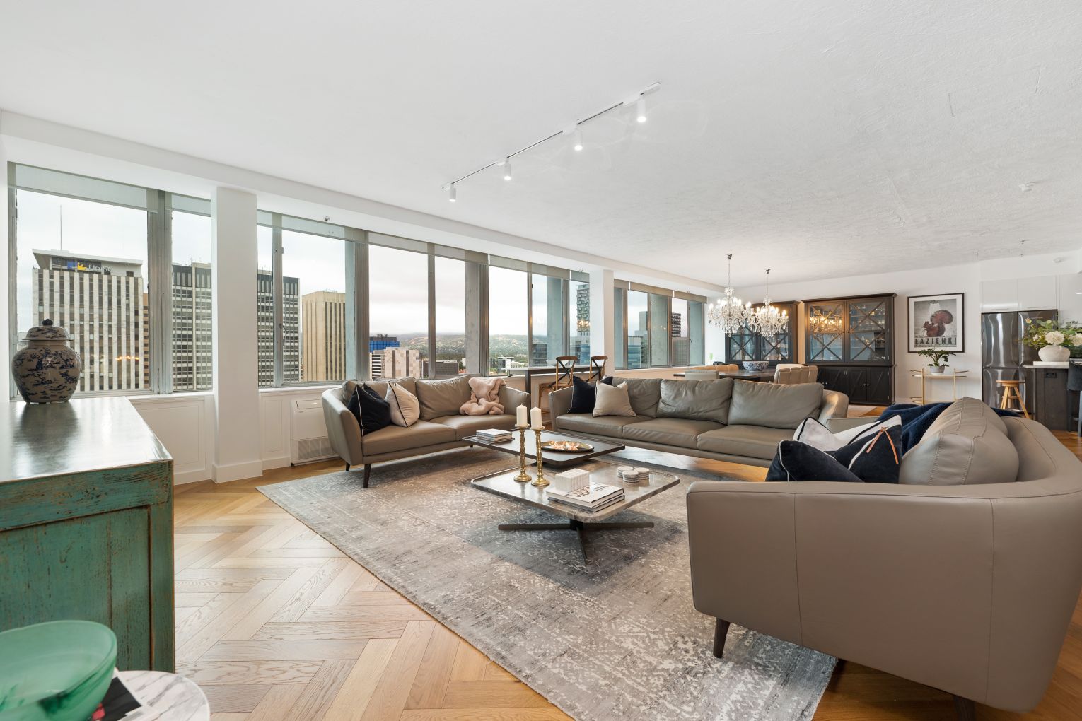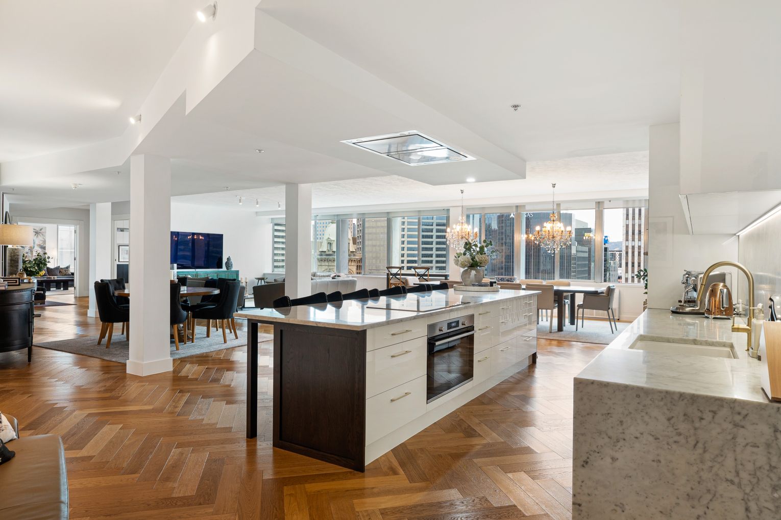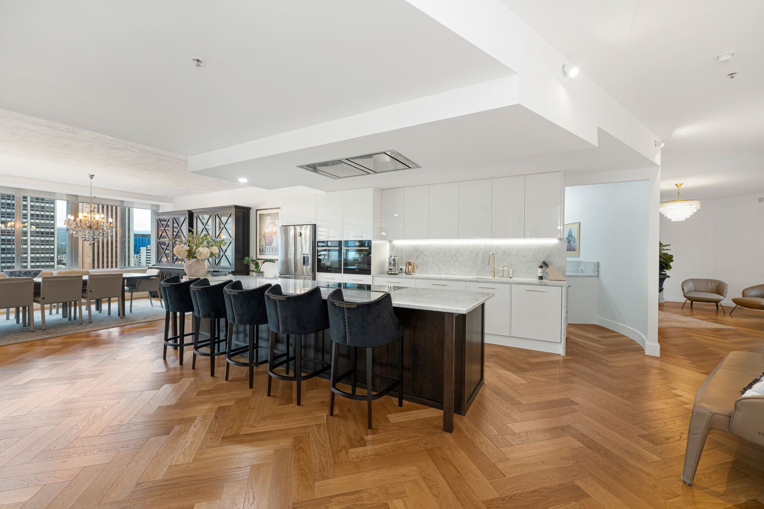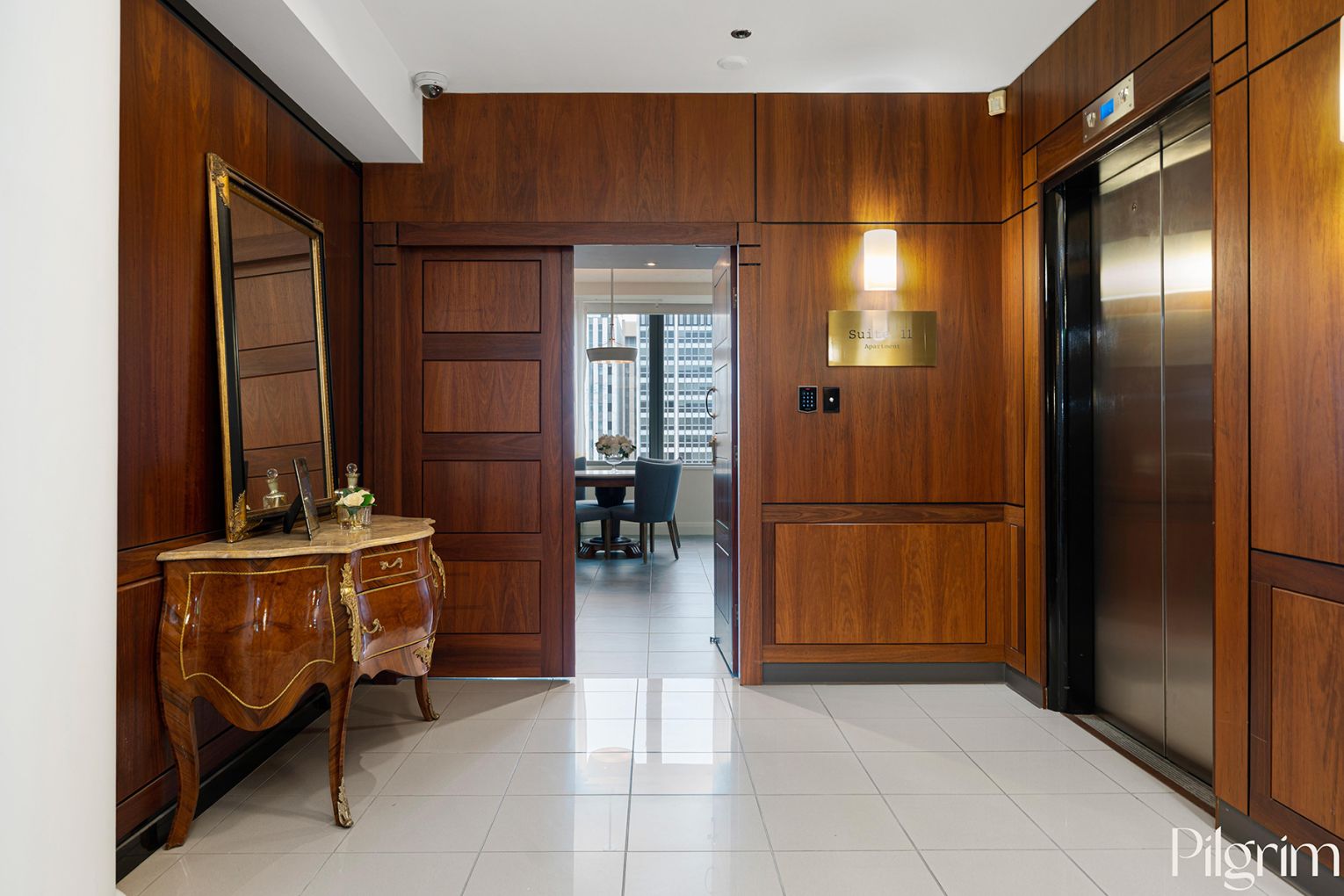 Arrival is a statement in itself. Accessed via three secure building elevators, you step into your private Level 11 foyer, where impressive glass double doors introduce the elegance and scale beyond. Expansive open-plan living and dining spaces unfold, flooded with natural light and framed by uninterrupted views across the square. French oak floors run throughout, exuding warmth and timeless elegance, while thick double-gyprock walls and sound-sealed doors provide an oasis of serenity above the city.