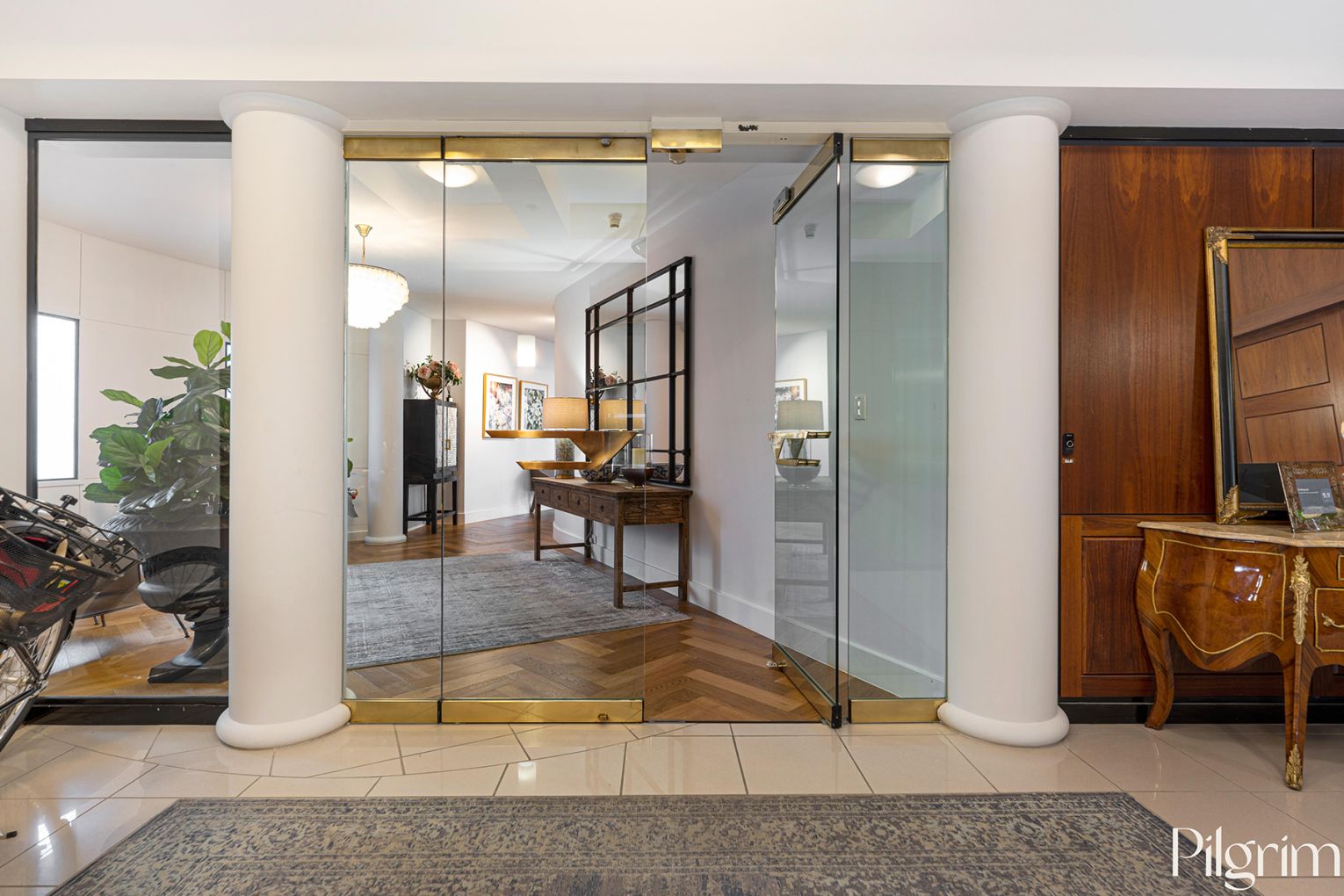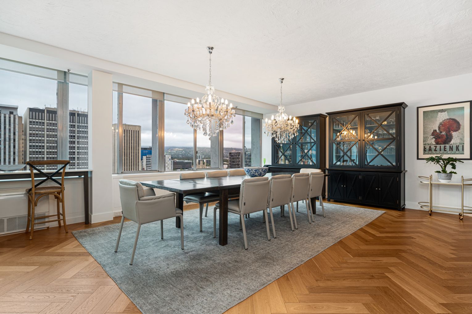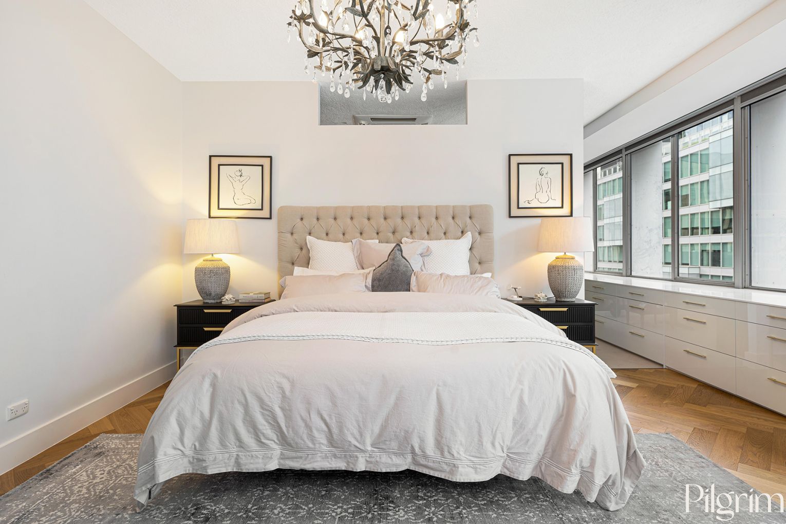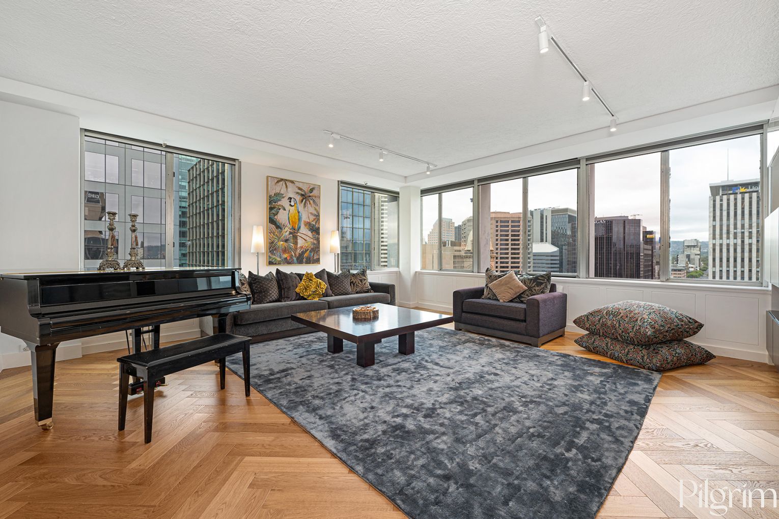 Arrival is a statement in itself. Accessed via three secure building elevators, you step into your private Level 11 foyer, where impressive glass double doors introduce the elegance and scale beyond. Expansive open-plan living and dining spaces unfold, flooded with natural light and framed by uninterrupted views across the square. French oak floors run throughout, exuding warmth and timeless elegance, while thick double-gyprock walls and sound-sealed doors provide an oasis of serenity above the city.