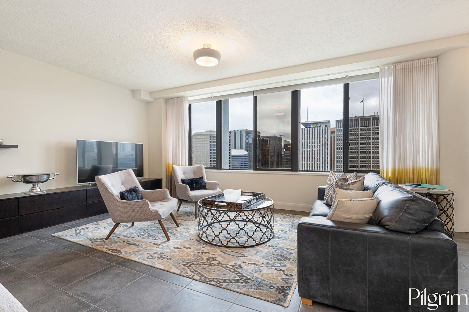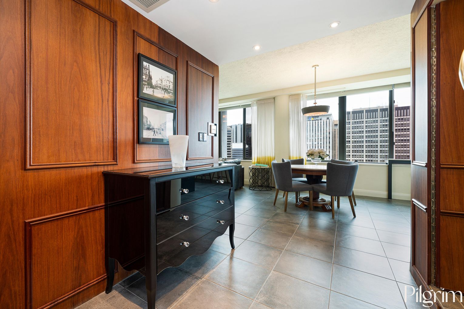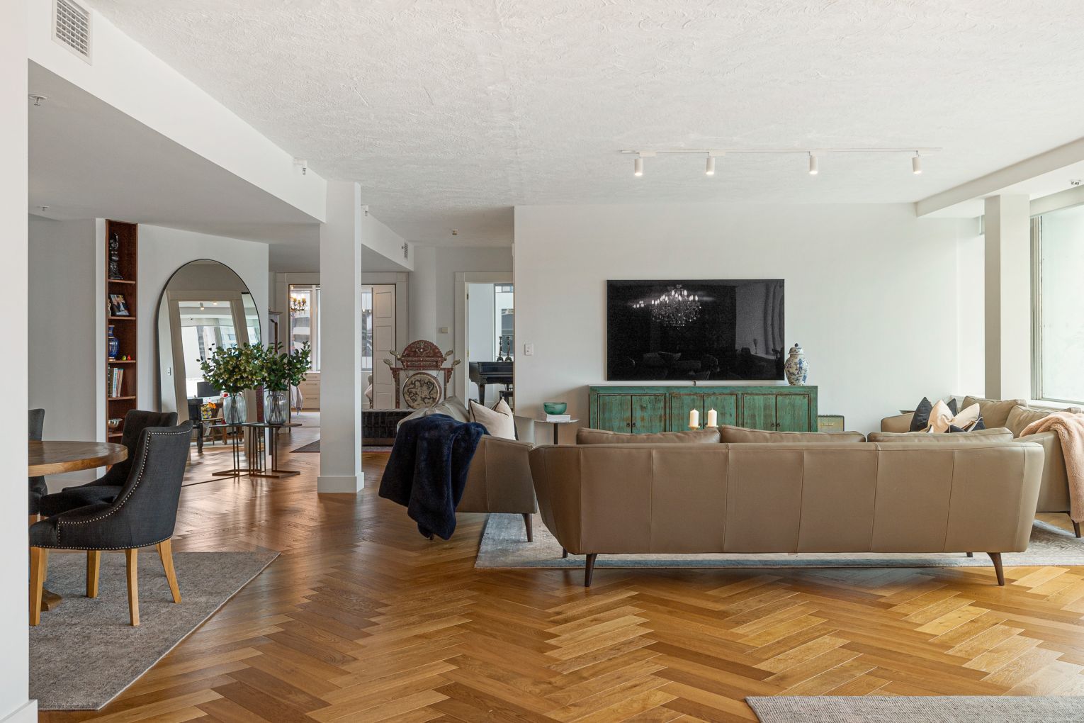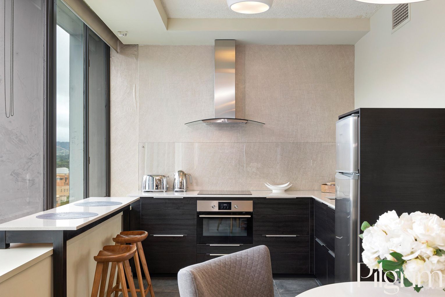 Arrival is a statement in itself. Accessed via three secure building elevators, you step into your private Level 11 foyer, where impressive glass double doors introduce the elegance and scale beyond. Expansive open-plan living and dining spaces unfold, flooded with natural light and framed by uninterrupted views across the square. French oak floors run throughout, exuding warmth and timeless elegance, while thick double-gyprock walls and sound-sealed doors provide an oasis of serenity above the city.