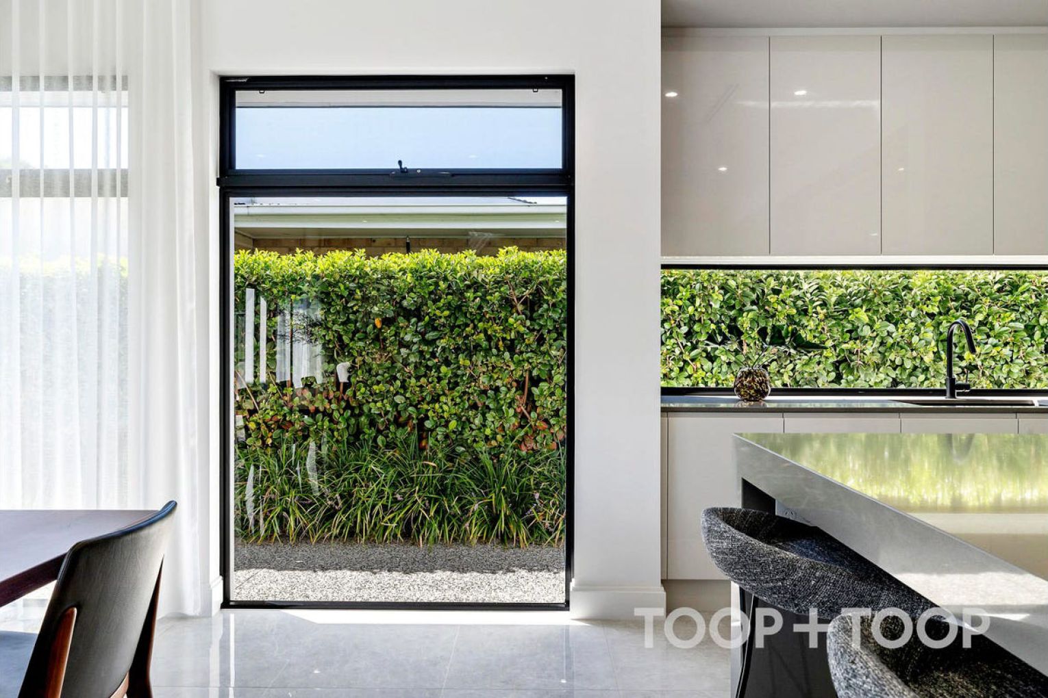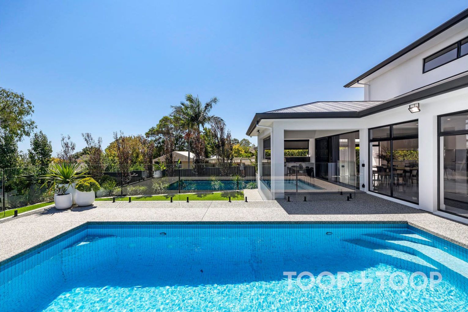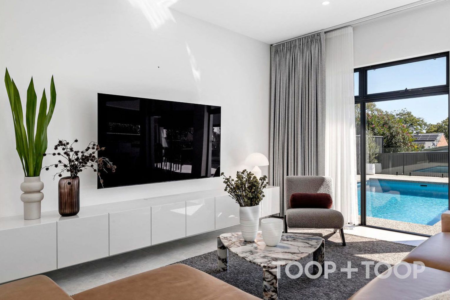 Sliding seamlessly outdoors, the living domain spills onto an entertainer’s alfresco, where evenings stretch long against the sparkling blue backdrop of the in-ground pool – a private resort setting primed for summer gatherings.