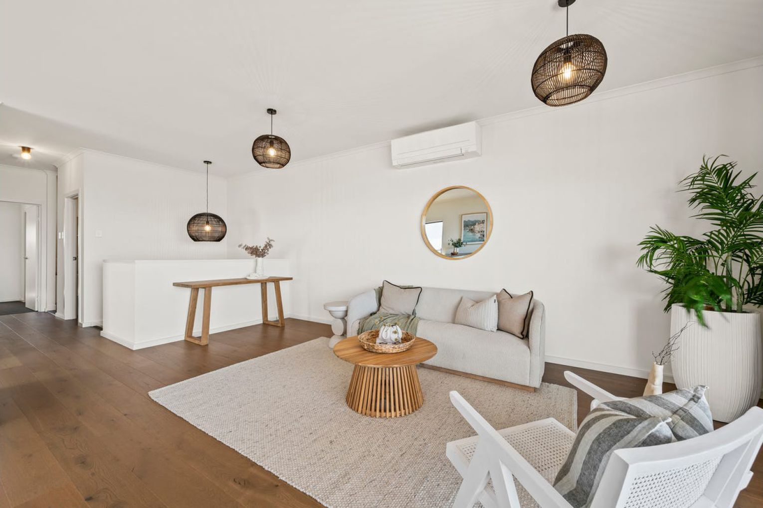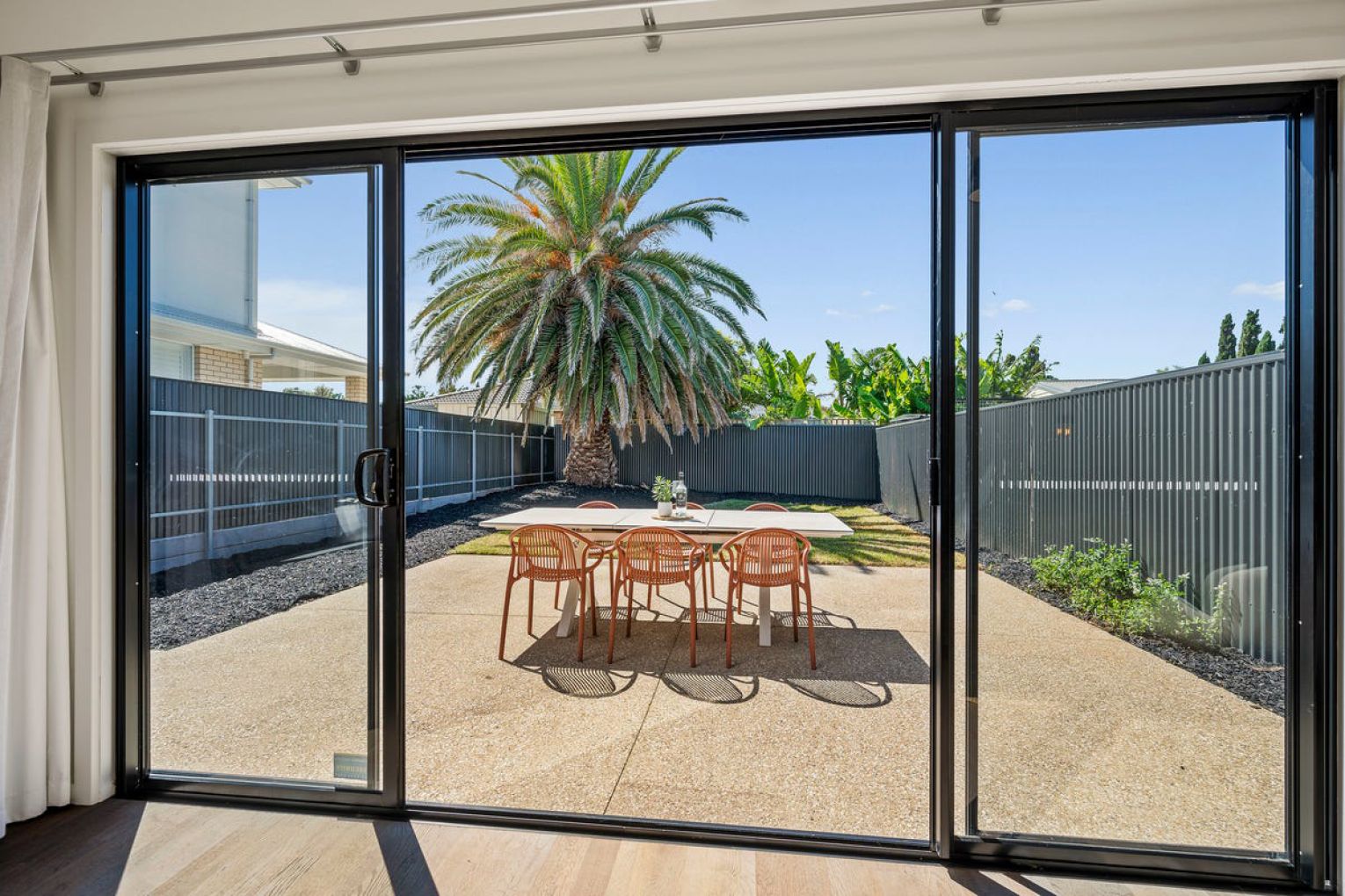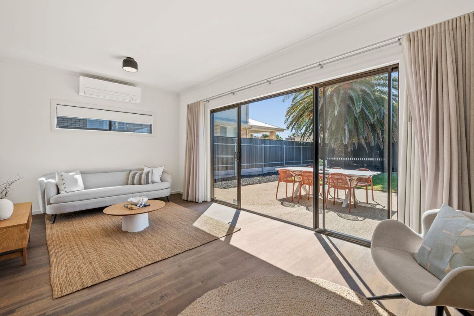 Downstairs has a second living area with a split system air conditioner. Glass sliding doors open to a wide patio and lawn with plenty of room to add fruit trees and vegetable beds. Two more bedrooms share a bathroom on the ground floor. There is also a laundry and extra storage under the stairs.