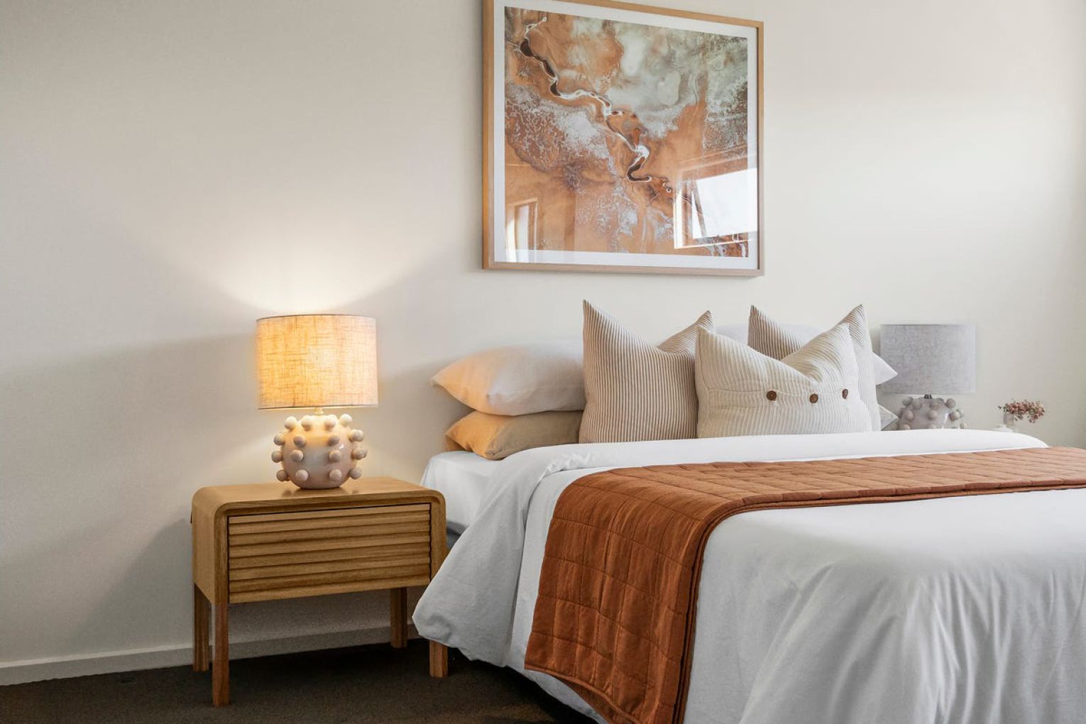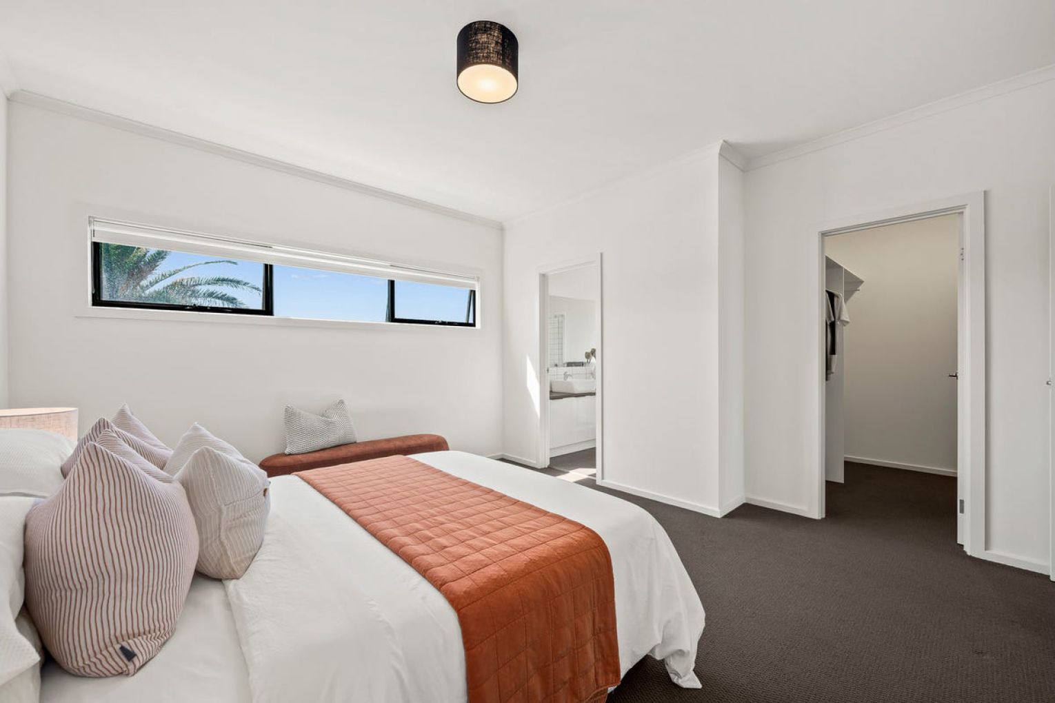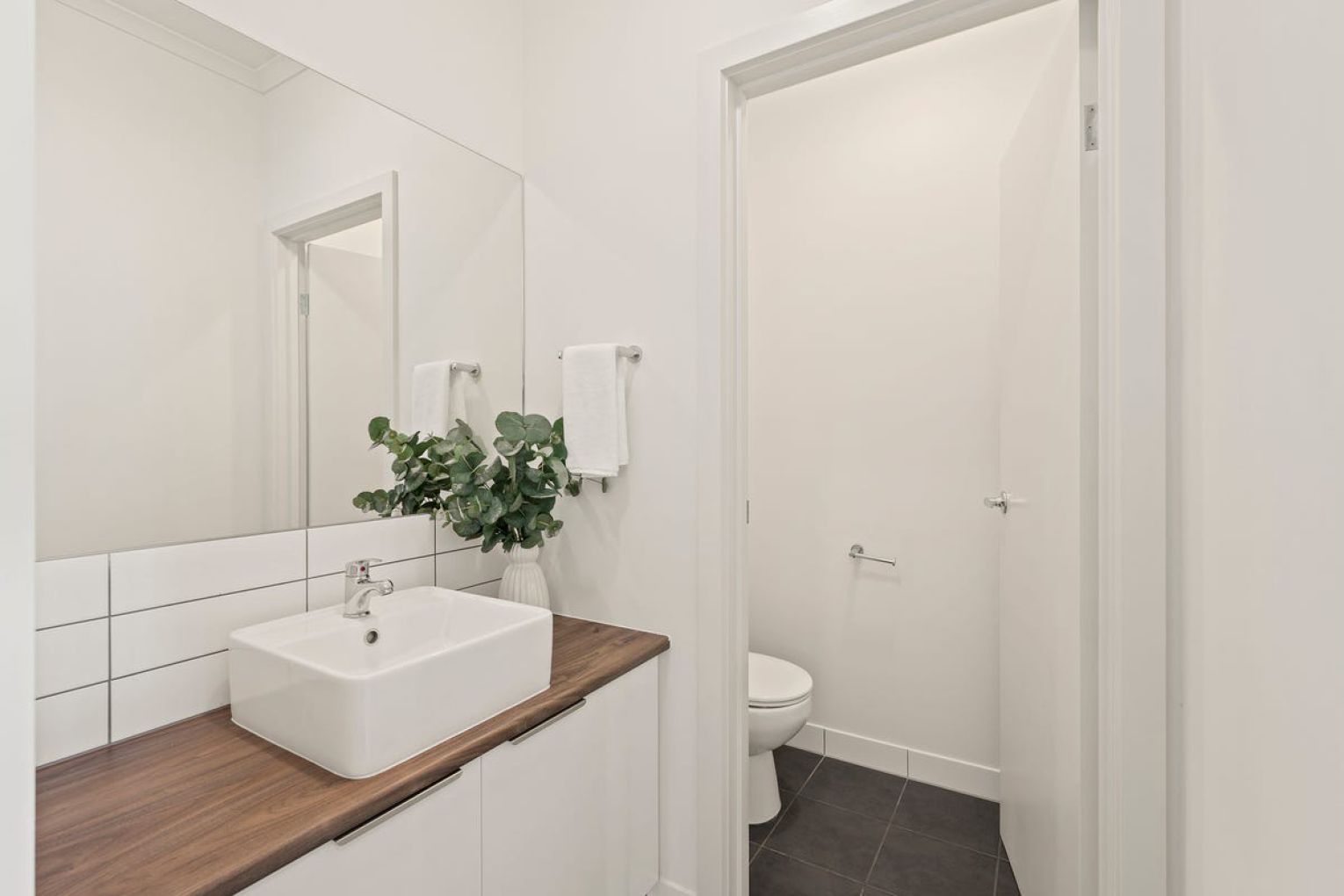 The generous master suite has a large walk-in robe and ensuite, complete with a bath. Adjacent is another good size bedroom. A convenient guest powder room is on this level.