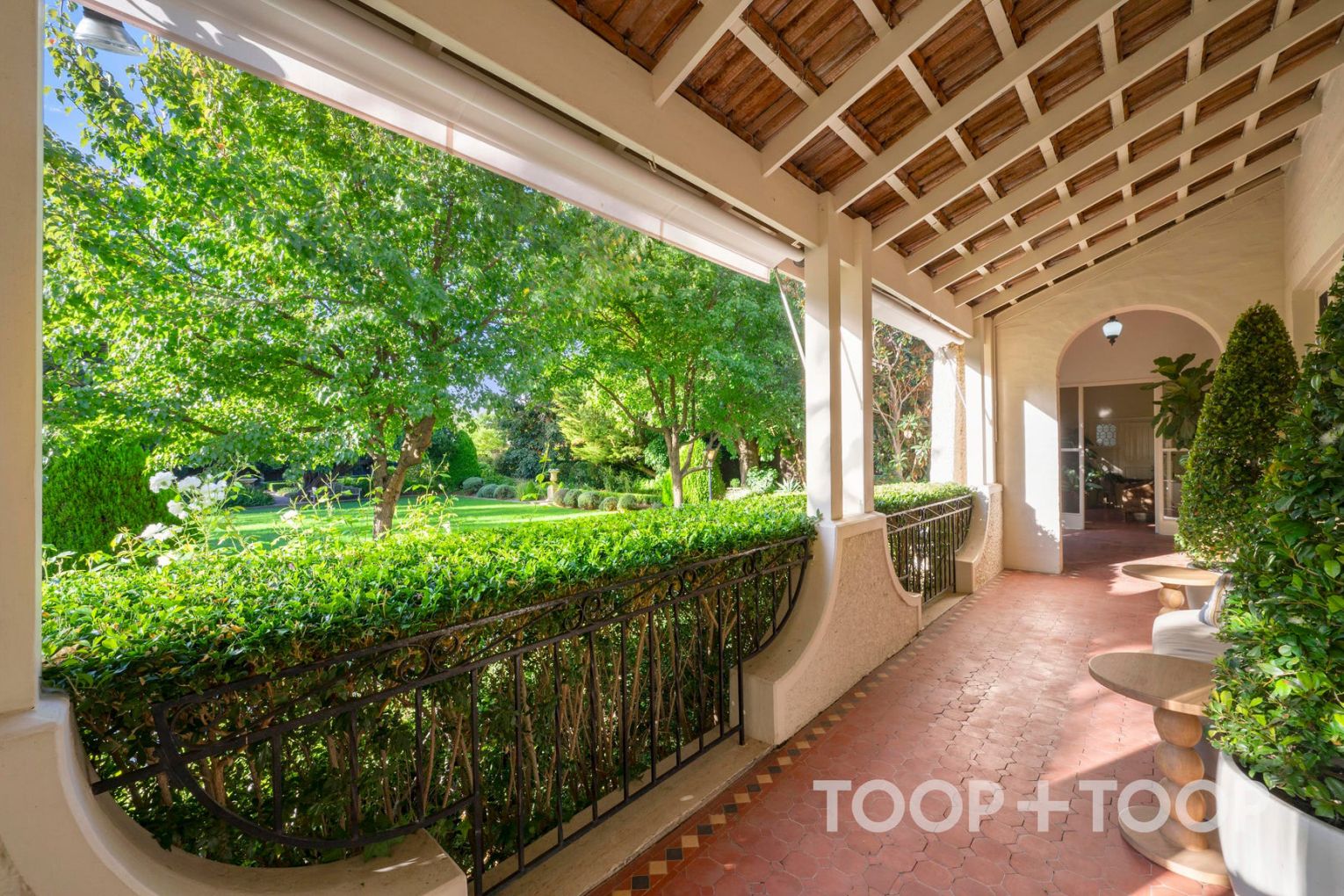 A generous setback from the road establishes a sense of arrival, with expansive landscaped gardens unfolding across the front approach. Mature trees and established plantings frame the home and give the grounds a settled, private feel, reinforcing the scale and significance of the site. A wide tessellated tile veranda is the perfect place to admire the grounds, the scene of many elegant gardens parties over the years.