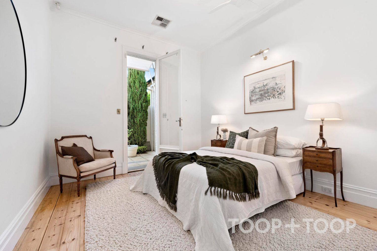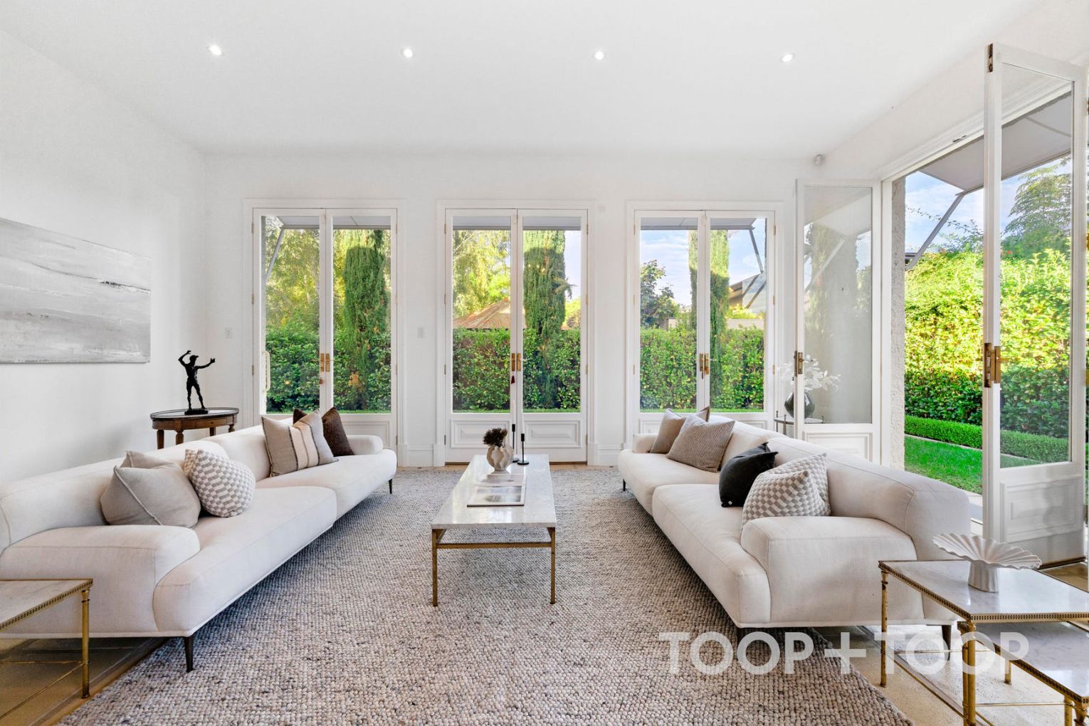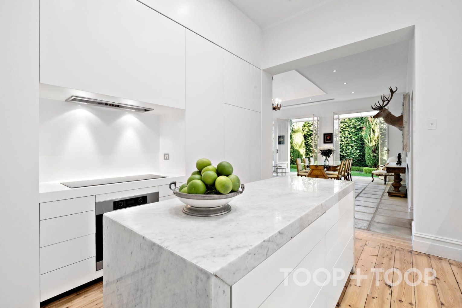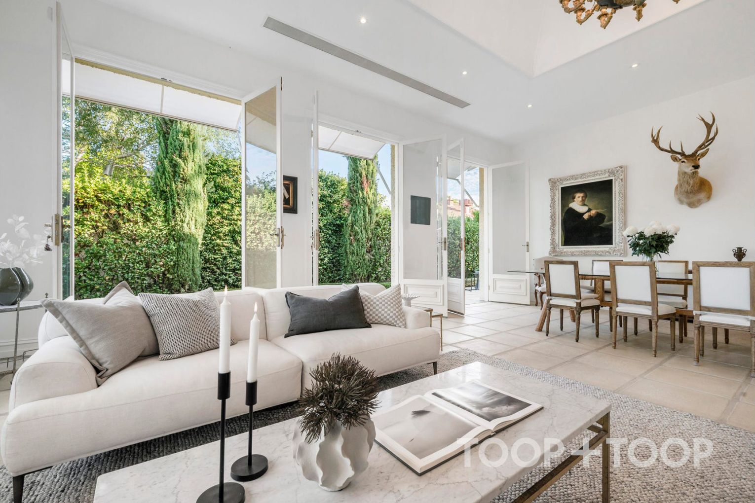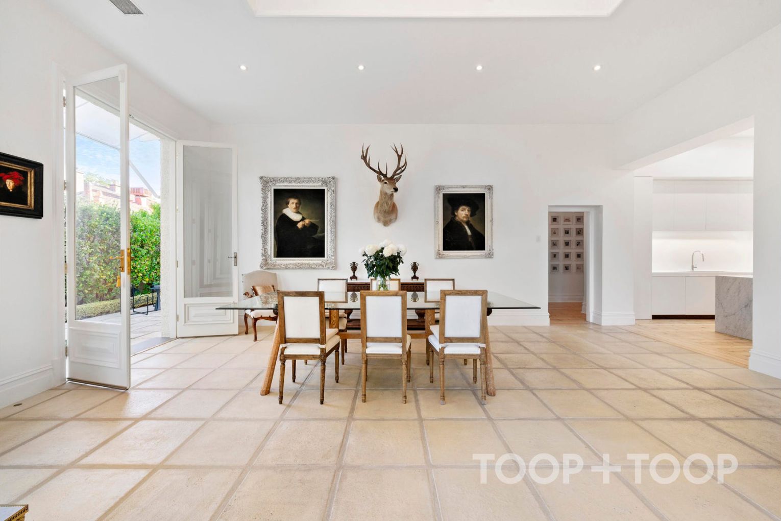 For day-to-day living, the well-equipped gourmet kitchen looks over a spectacular family meals room designed by Pauline Hurren—an important point of distinction that connects culinary function with considered design. Multiple French doors impart a feeling of light and warmth in all seasons, drawing in soothing views of the elegant and private rear yard.