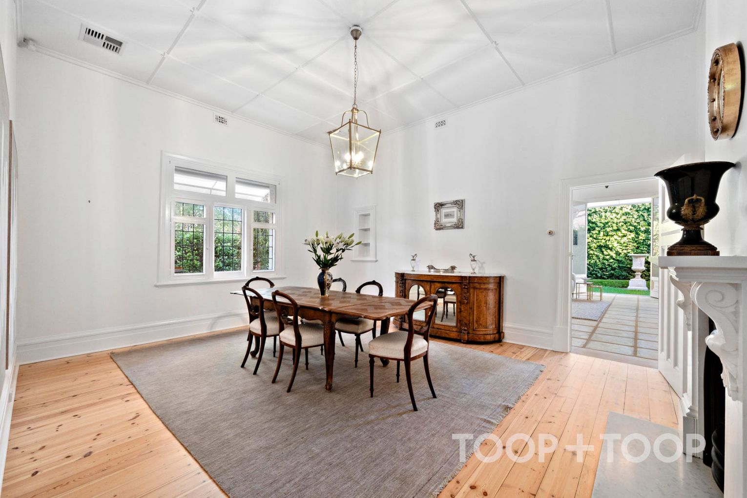 Inside, the architecture retains the character details that define homes of this calibre and era. Tall ceilings and decorative cornices bring proportion and formality, while open fireplaces create natural focal points through the principal rooms. Leadlight adds a crafted note to the home’s outlook, and expanses of Baltic pine floorboards run through the interiors, grounding the spaces in warmth and authenticity.
