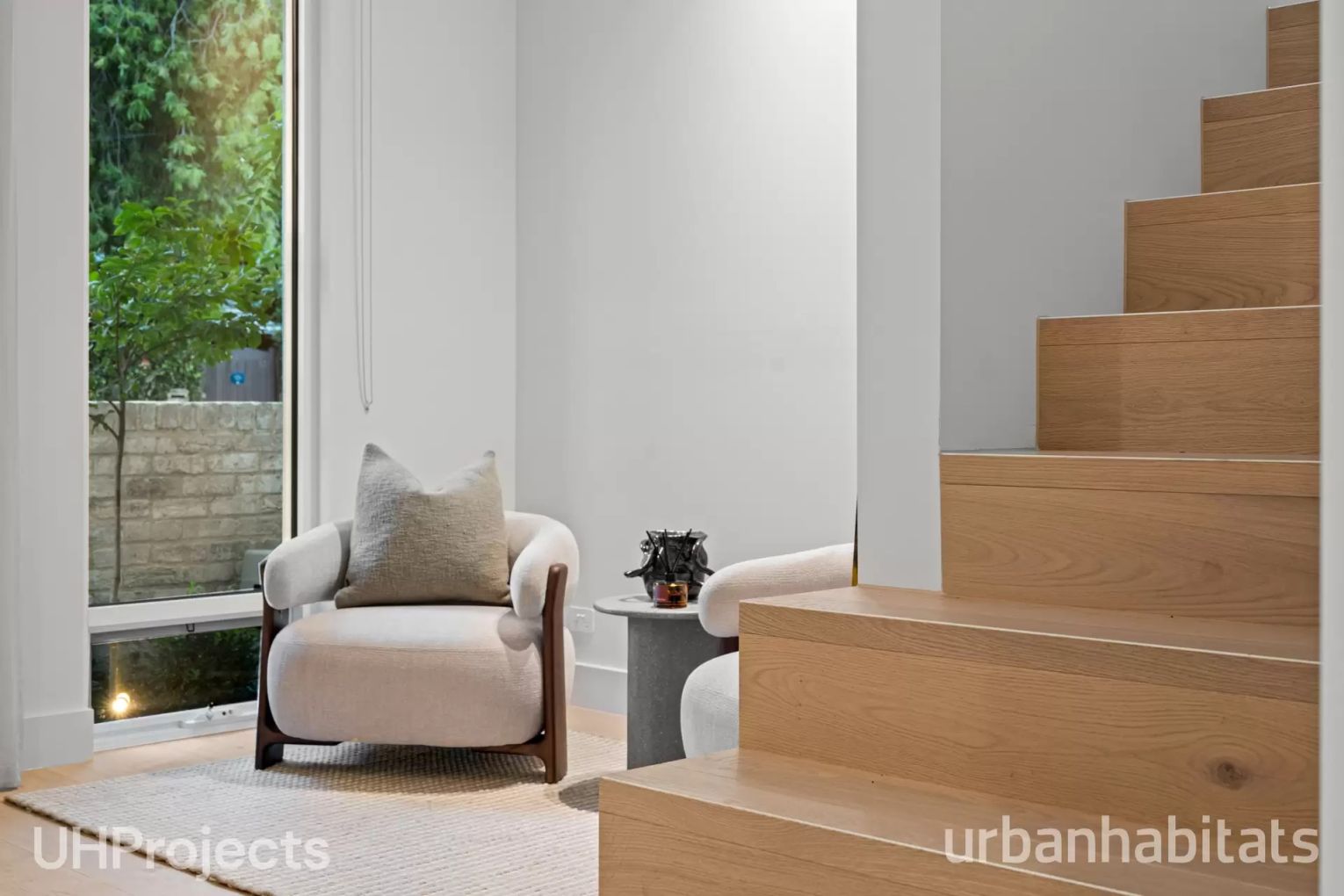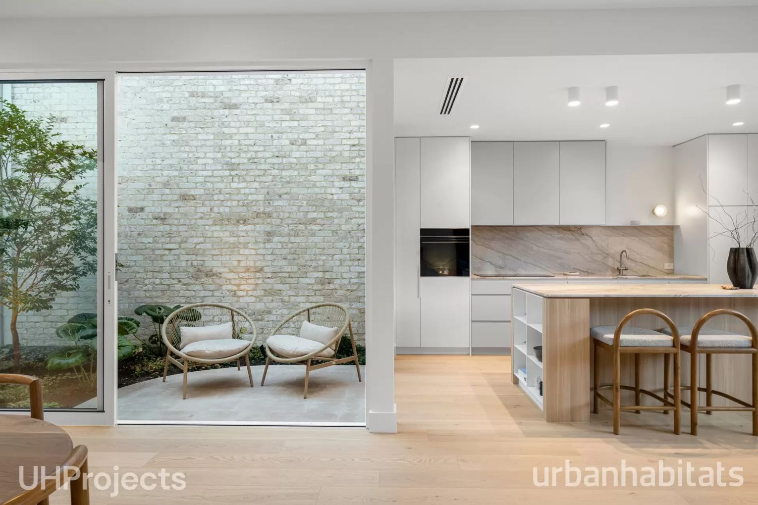 Thoughtfully arrayed across two spacious levels, accessible by both a feature skylit stairwell and a home elevator, the residence is comprised of 3 generous bedrooms (Master with Ensuite and copious amounts of floor-to-ceiling BIR’s), 2 luxurious and sleek bathrooms plus powder room, valuable off-street parking for 2 vehicles and multiple courtyards and outdoor entertaining spaces.