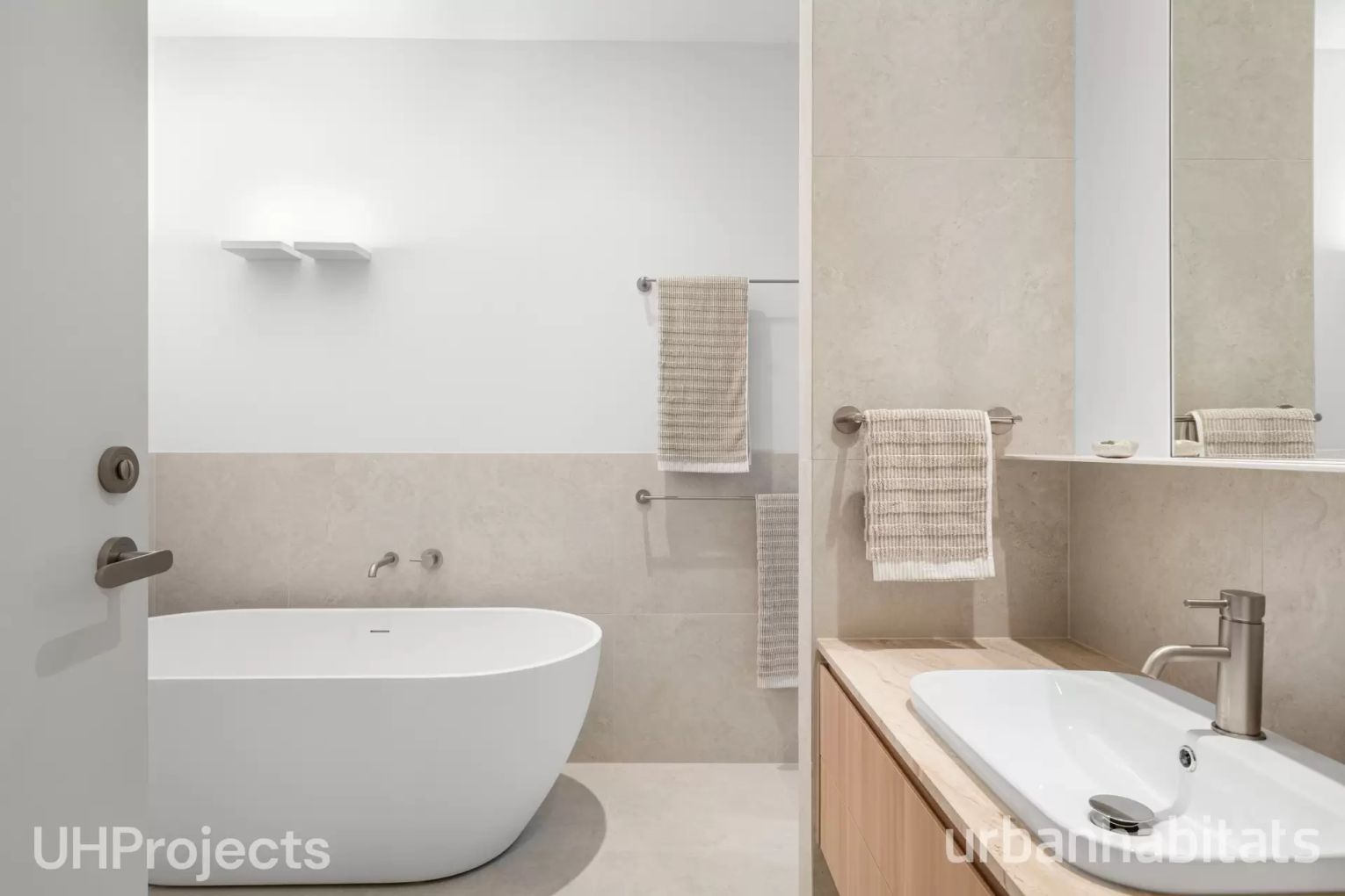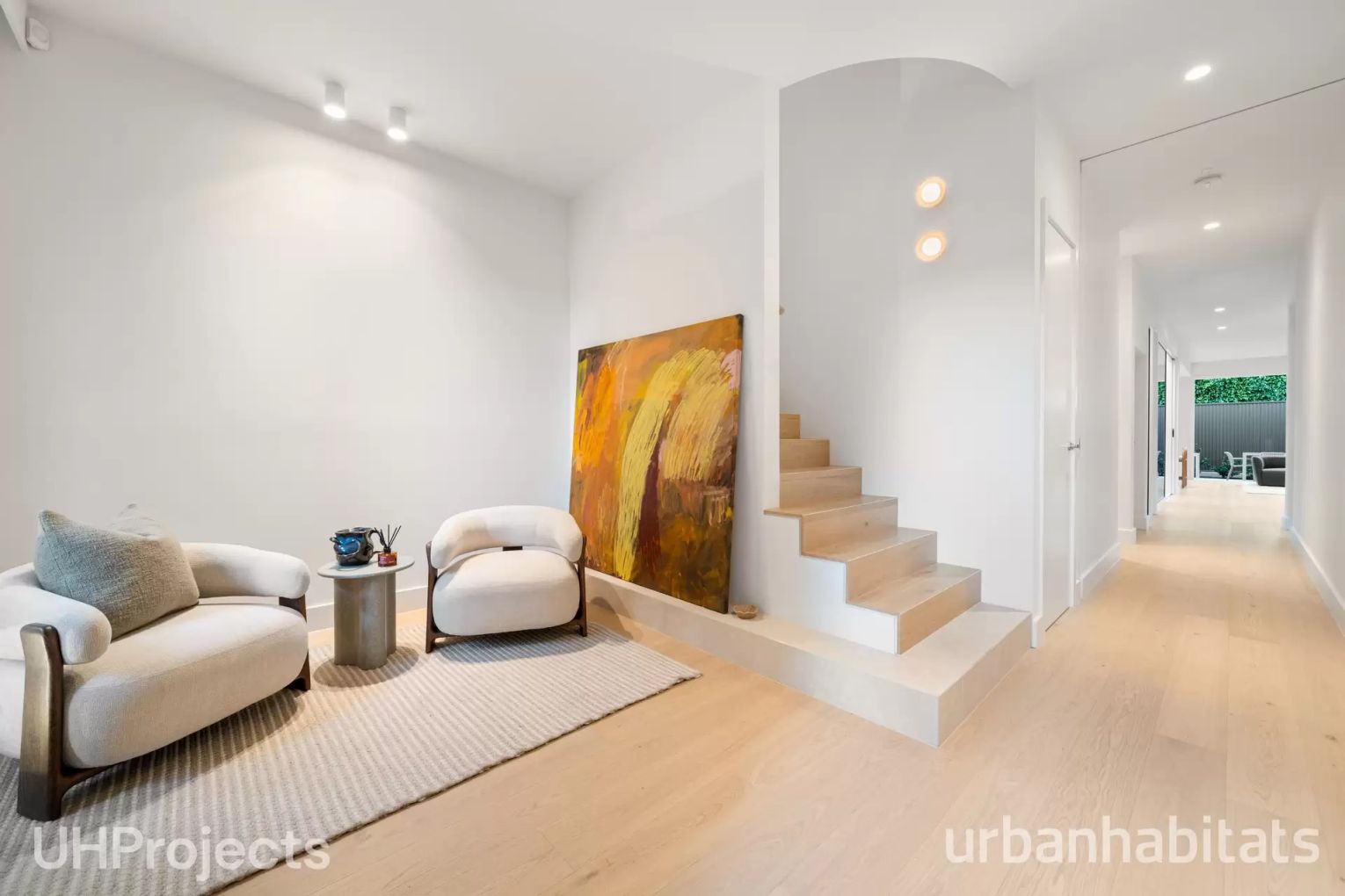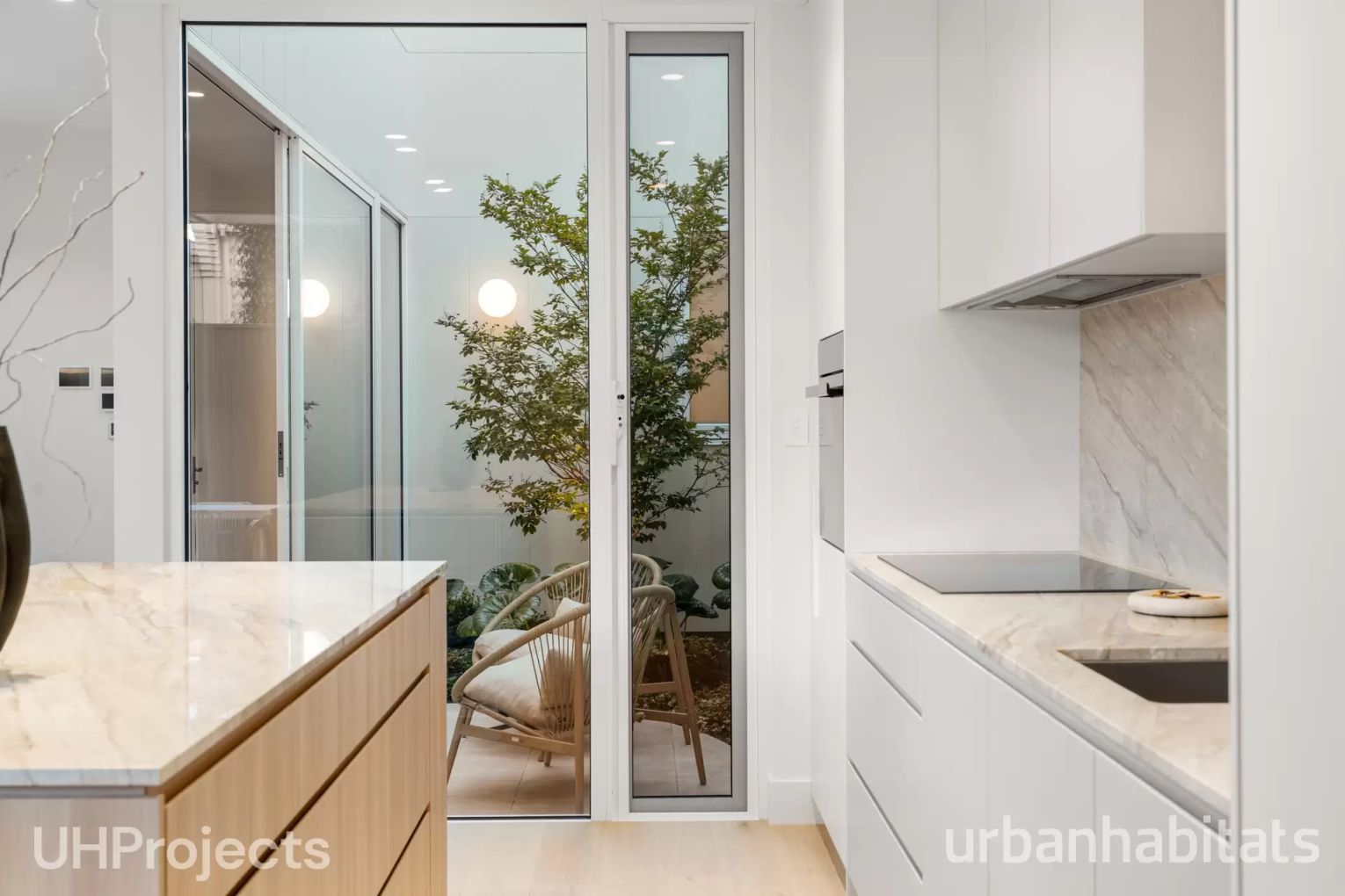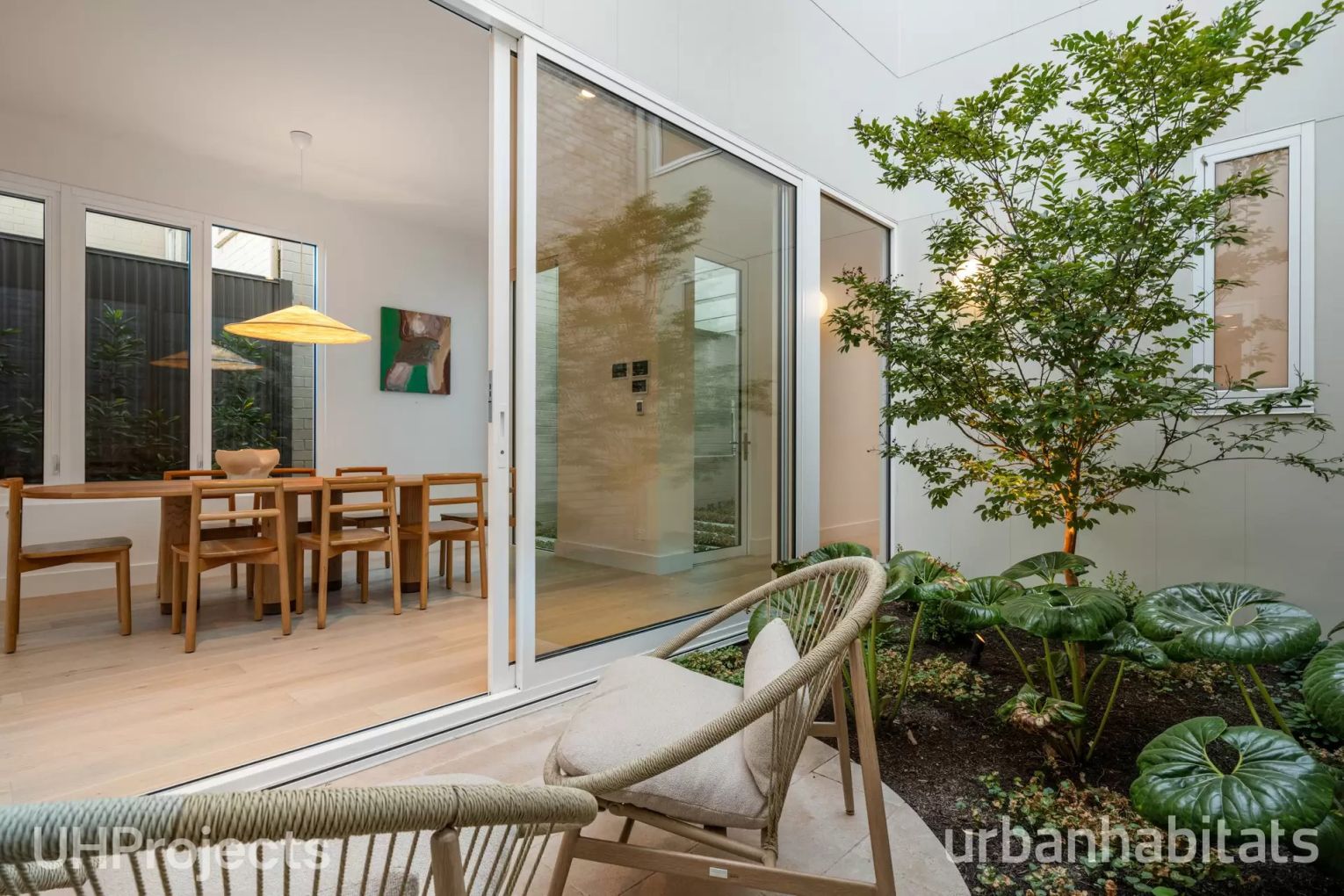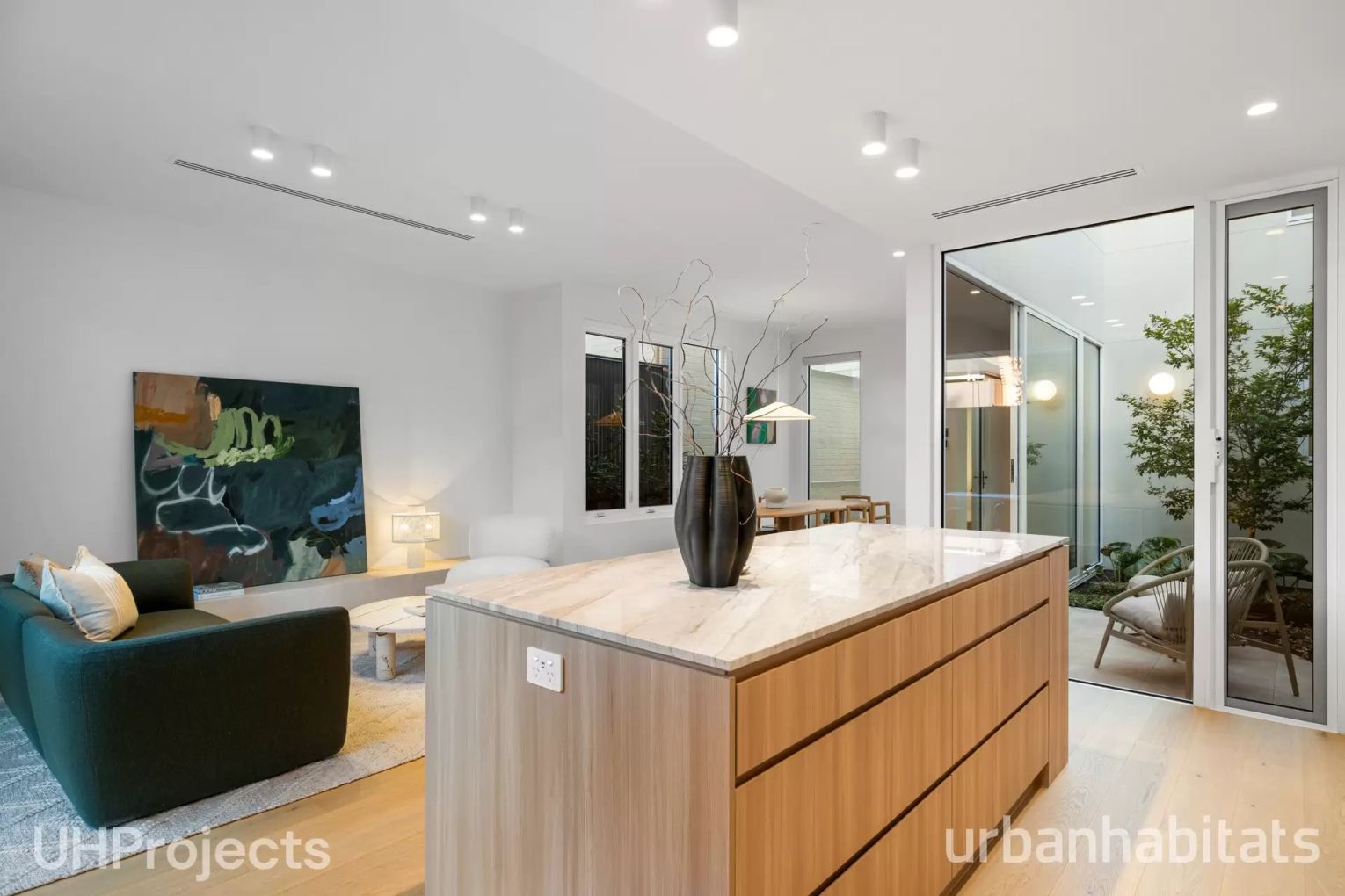 Defined by towering walls of double-glazed glass which invite the landscaped green spaces of multiple sunny and light-filled courtyards into the home, combined with soaring 3m ceiling heights downstairs, this brand-new free standing residence of distinction offers a high quality and significantly more private and appealing alternative to apartment living.