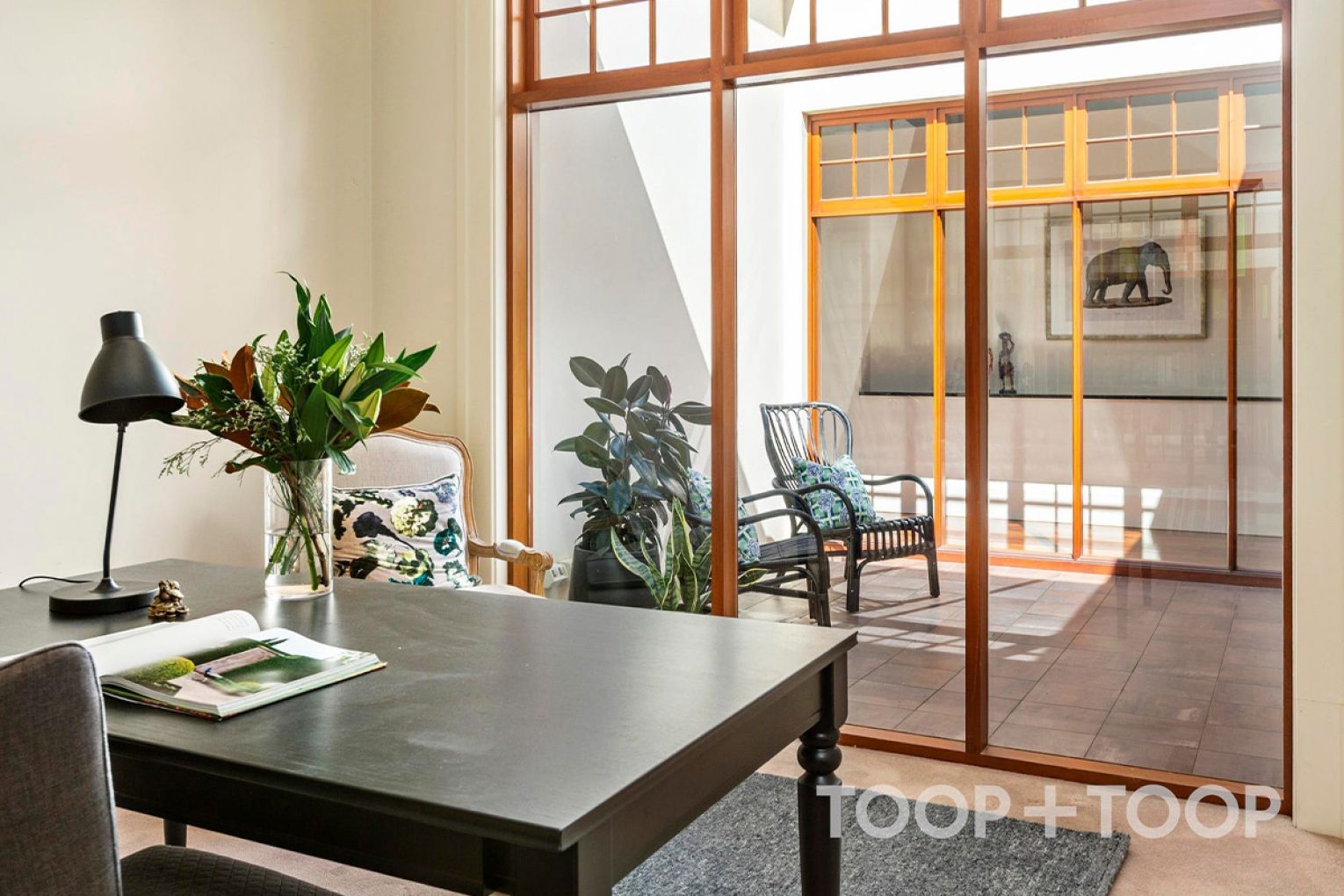 A privately situated home office looks through full length windows into a light filled atrium with a powder room and laundry close by.