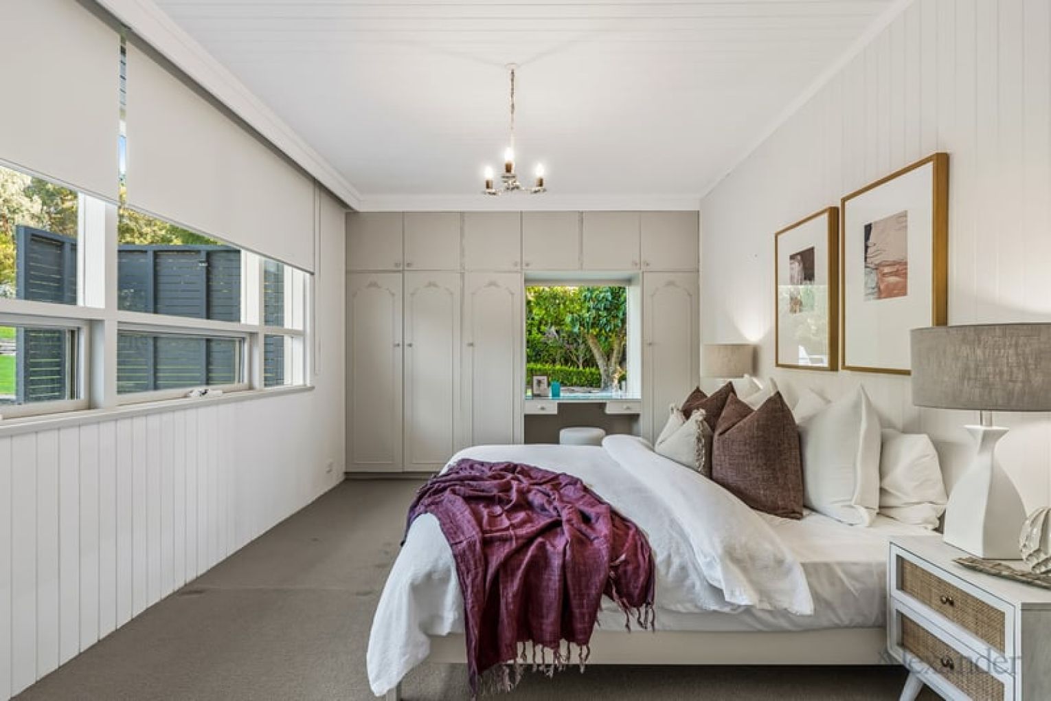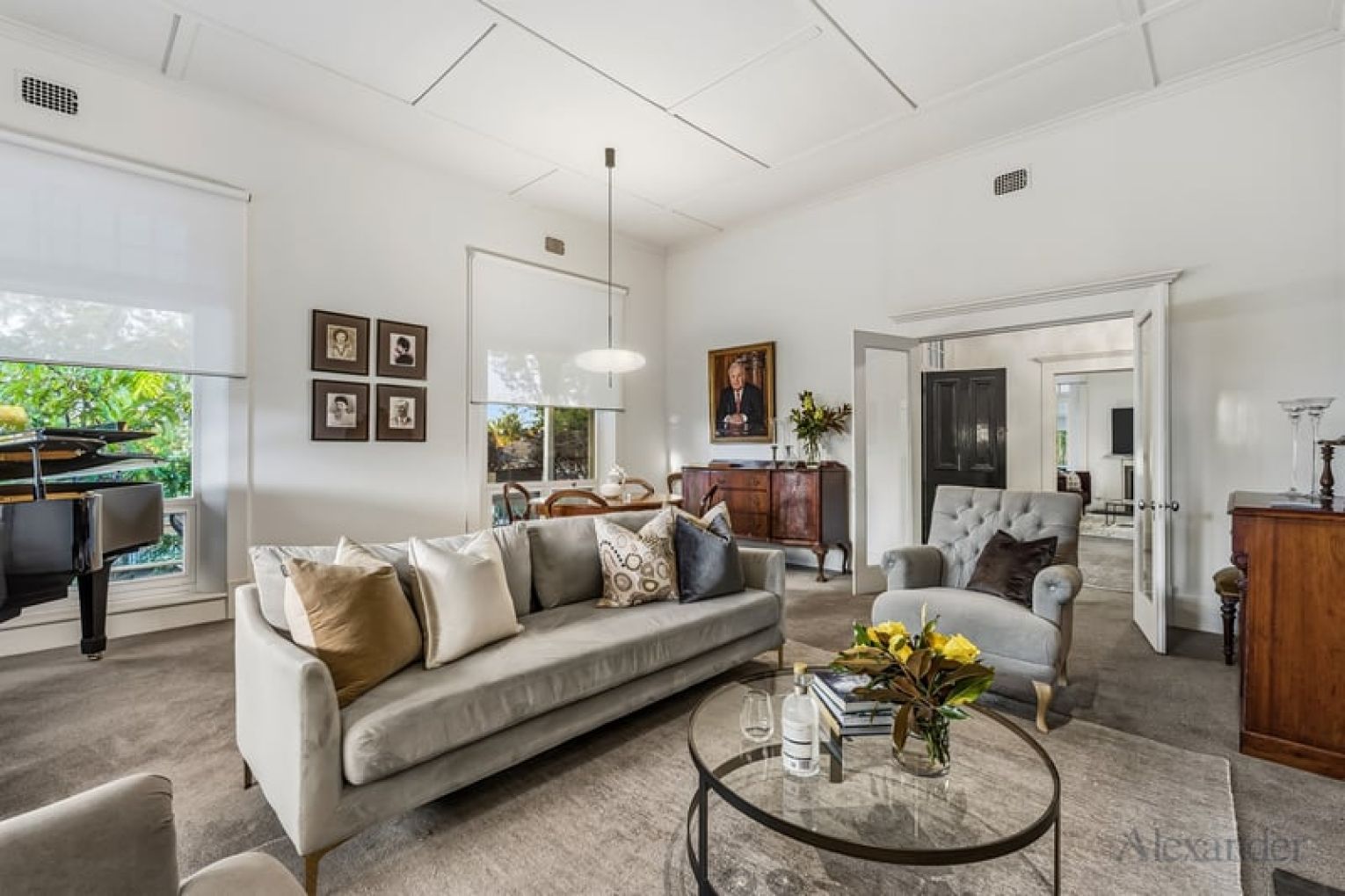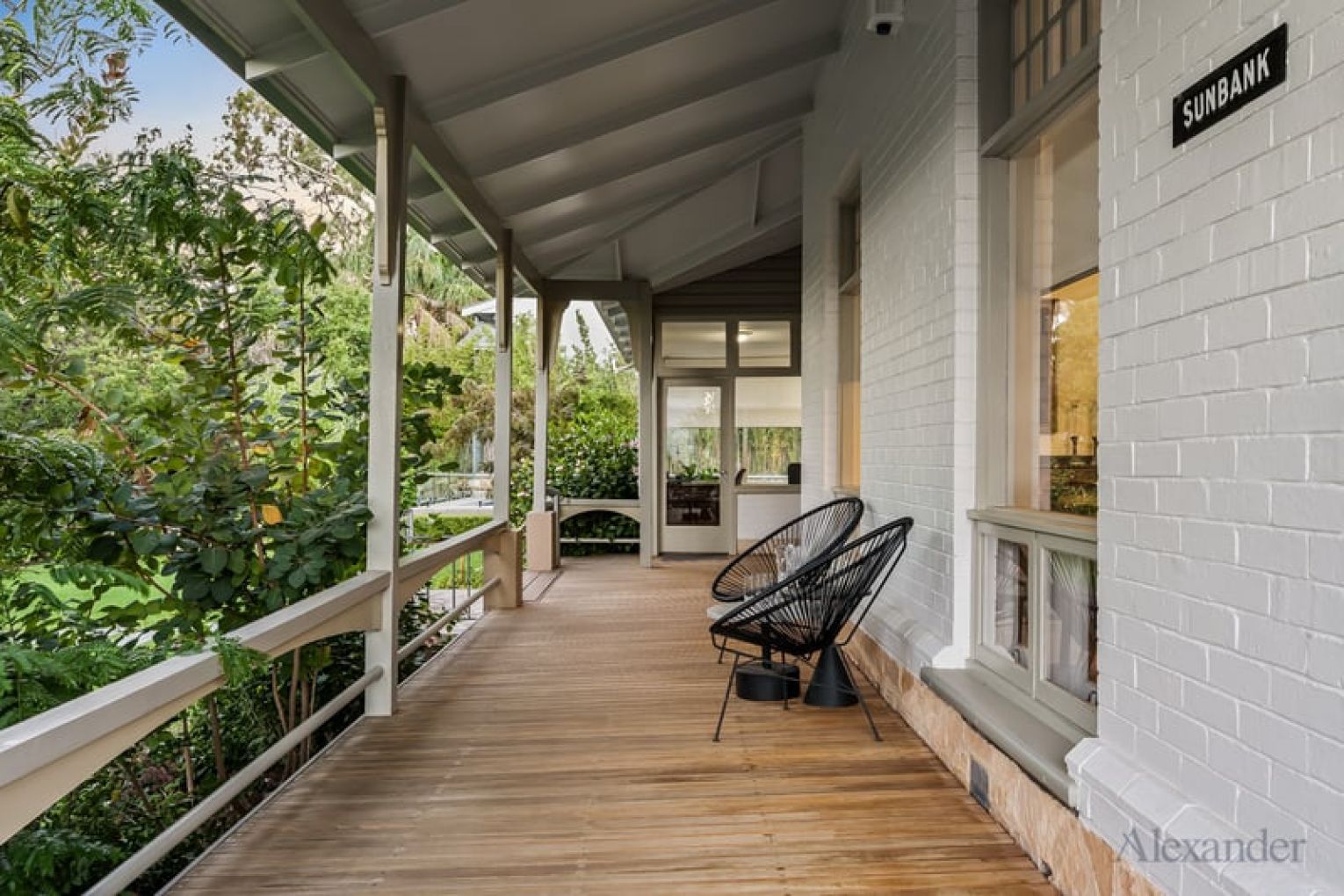 A charming decked verandah welcomes you on arrival, an idyllic setting for your morning coffee, or evening aperitivo. Beyond, a grand light-filled entrance reveals soaring ceilings, chandelier, cloakroom, and plush carpeting that flows through the formal living areas and bedrooms.