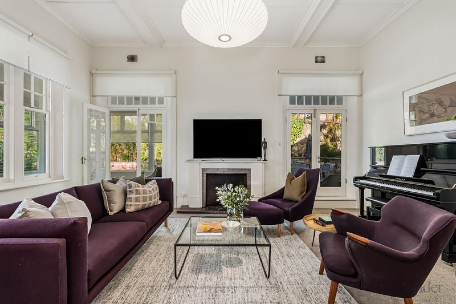 The formal lounge, accessed via elegant French doors, is rich in character and scale, featuring lofty ceilings, a fireplace, and captivating garden outlooks-perfect for entertaining, quiet evenings by the fire, or indulging beside the grand piano.