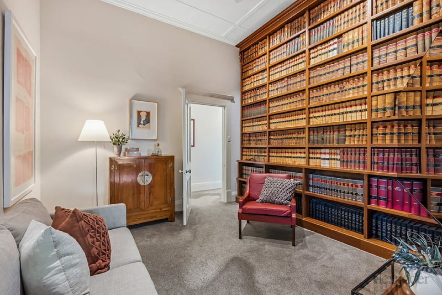 Accommodation comprises four generous bedrooms, all filled with natural light and garden views, three with built-in wardrobes. The main bedroom is a peaceful retreat, while all bedrooms are serviced by a nearby shower room, separate toilet, and a spacious laundry with direct outdoor access. A library or additional sitting room provides a quiet space for reading, reflection, or relaxed living.