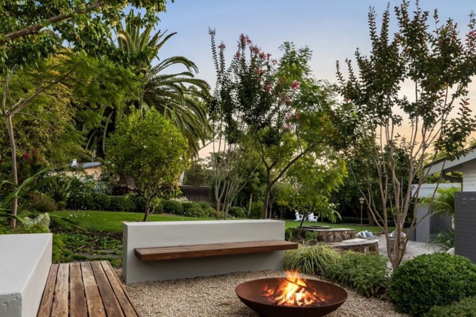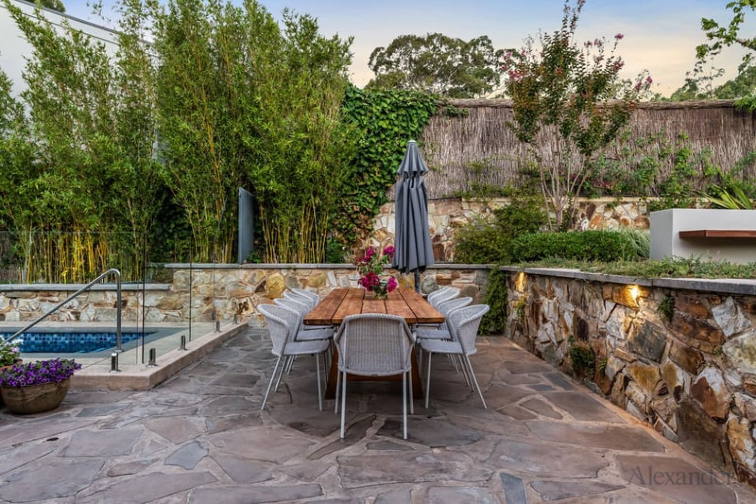 A second living room at the front of the home offers flexibility as a formal dining room or additional sitting area, also with a fireplace. This space opens to an enclosed verandah currently used as a study, before leading outdoors to the home’s spectacular poolside entertaining zone. Here, locally sourced stone walls, alfresco dining, a fire pit, and flourishing herb gardens frame the sparkling, resort-style magnesium-mineral swimming pool, creating an environment reminiscent of a private retreat.
