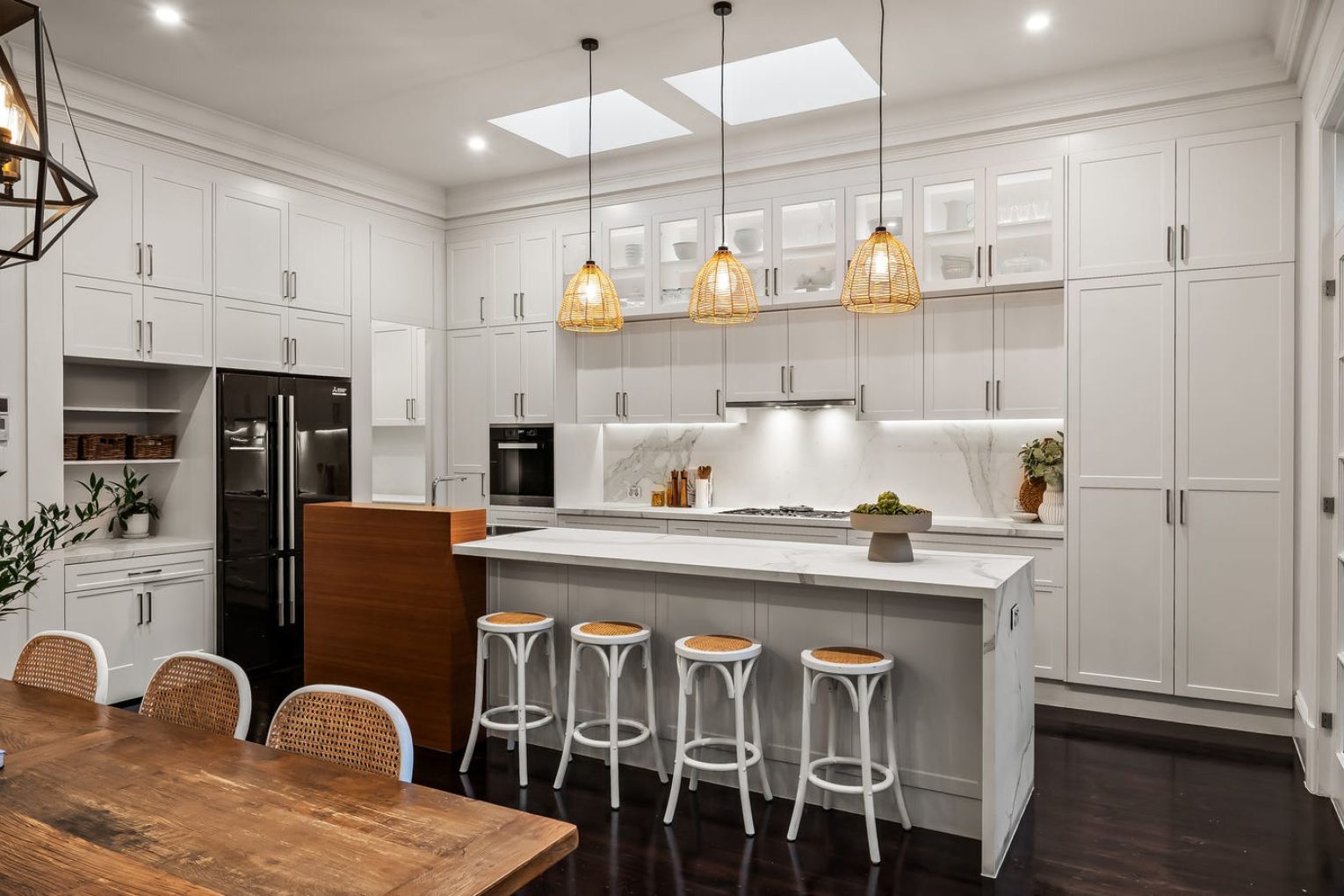 The undoubted shining star: a custom shaker-style kitchen with thick stone benchtops, integrated Miele appliances, butlerâs pantry and an expansive island/breakfast bar that glows under a pair of Velux skylights.