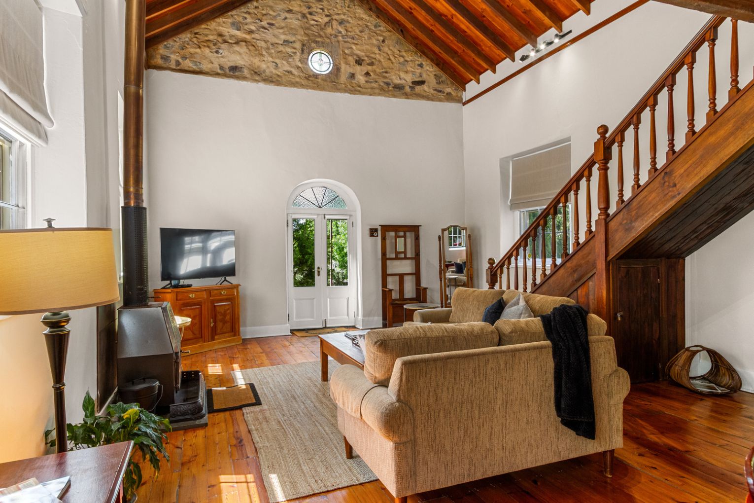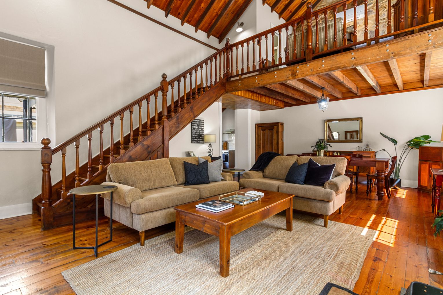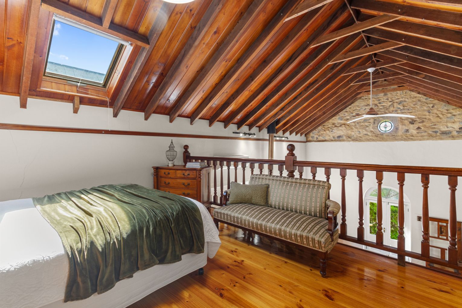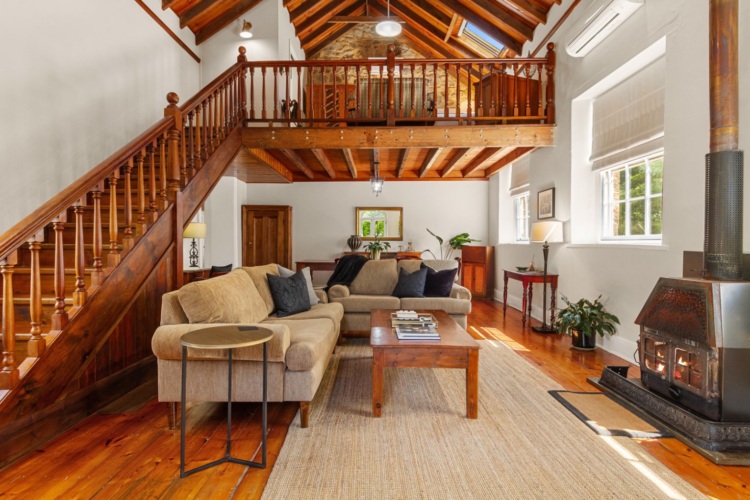 The feature mezzanine bedroom is accessed by a striking salvaged staircase and includes an ensuite, skylight, exposed stone detailing, and elevated views over the living areas below.