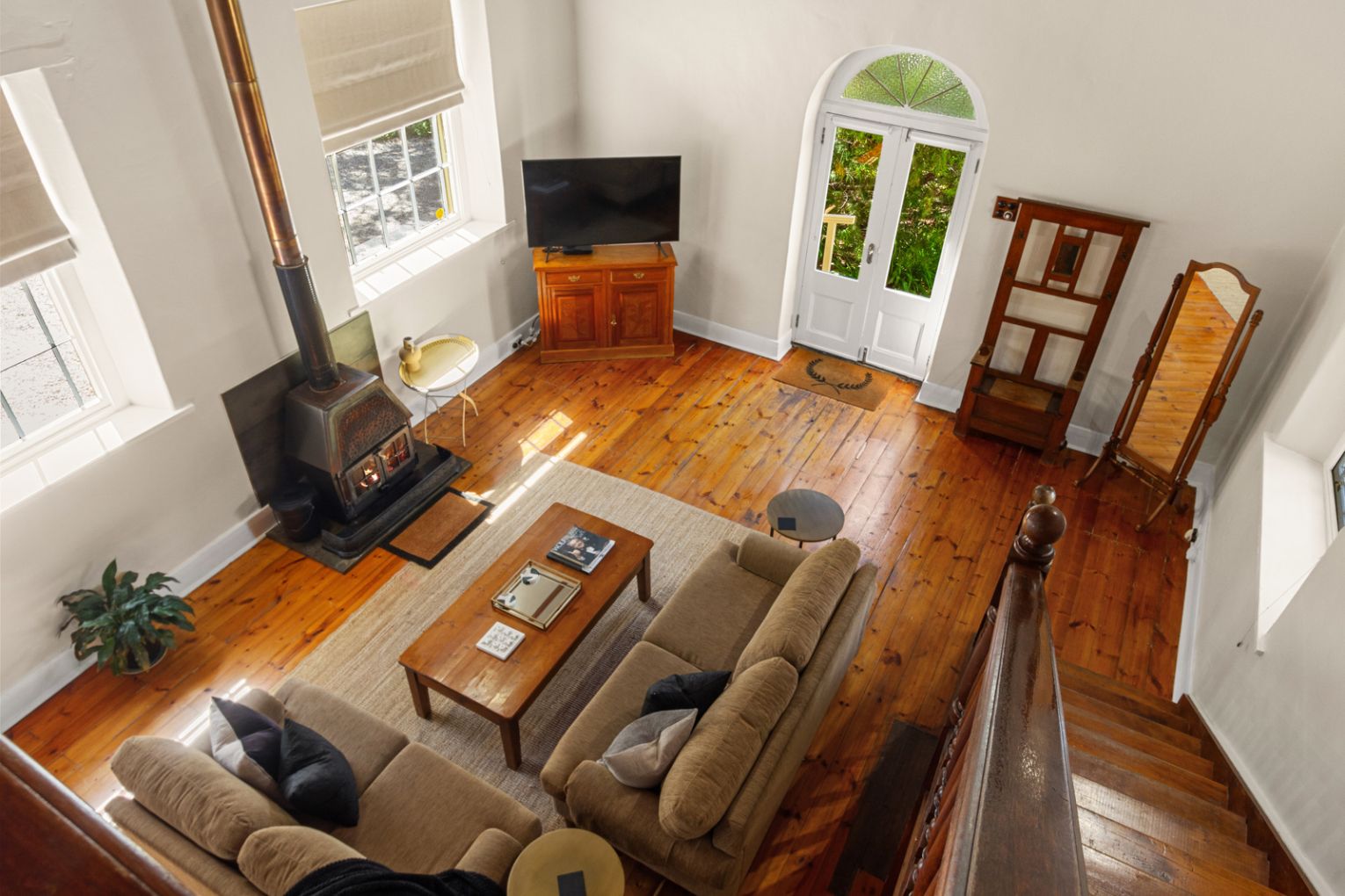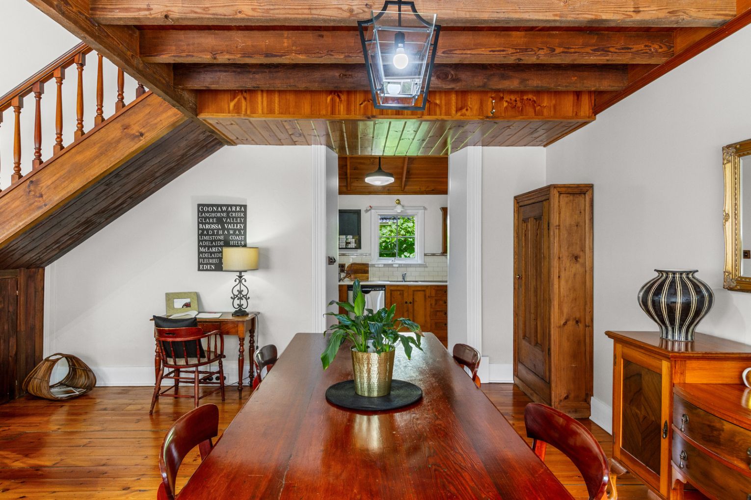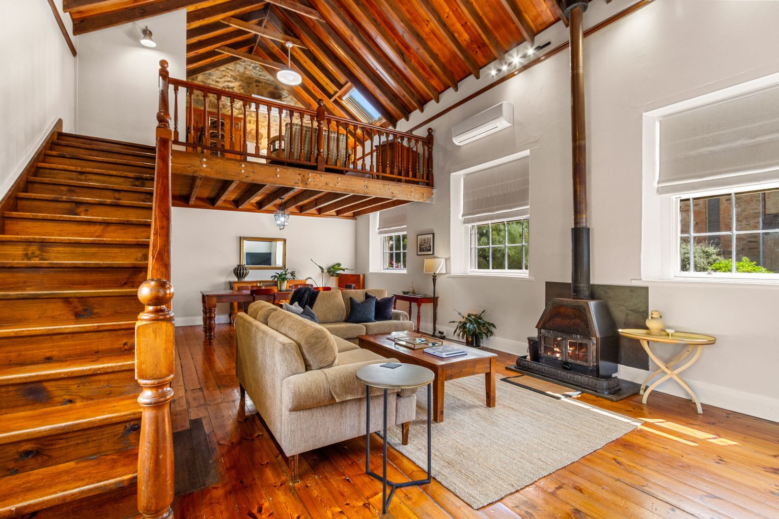 Your eye is drawn upward to the soaring matchboard ceiling, across the generous sitting and dining spaces, and finally to the impressive mezzanine level-crafted from salvaged beams sourced from the historic Jam Factory.