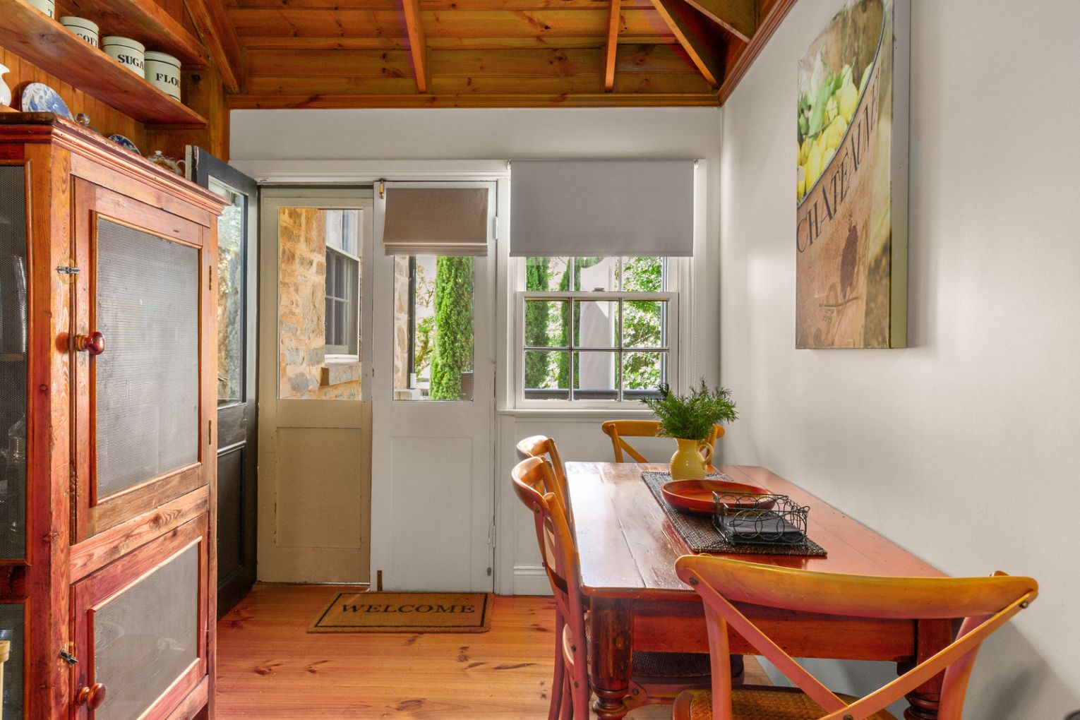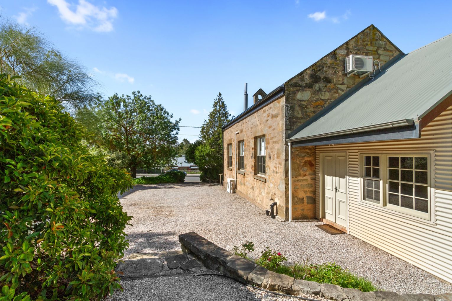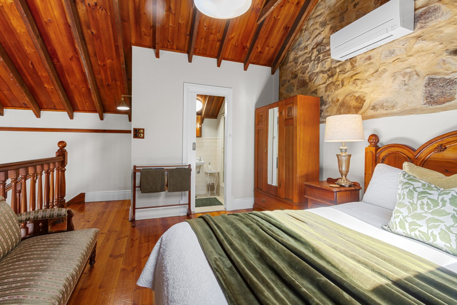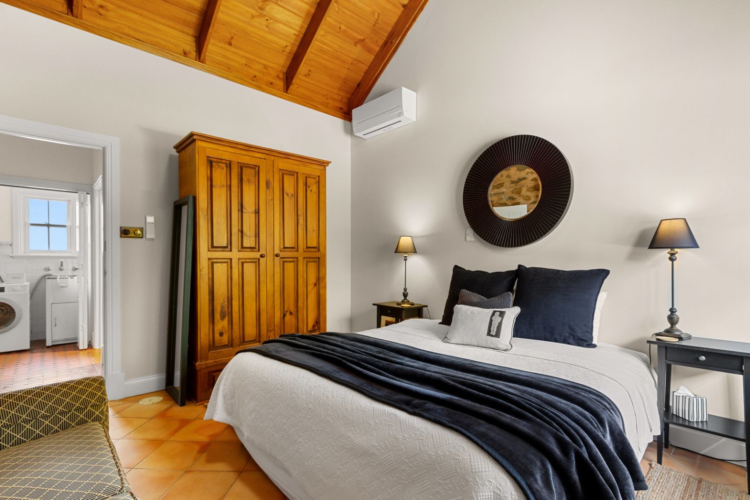 At the rear of the building, the second bedroom showcases exposed timber cathedral ceilings, handmade tiled floors, and the original, exposed stone back wall, enhanced by natural light filtering through a set of French doors. The downstairs area also includes a main bathroom with spa, separate shower, toilet, and a cleverly concealed laundry.