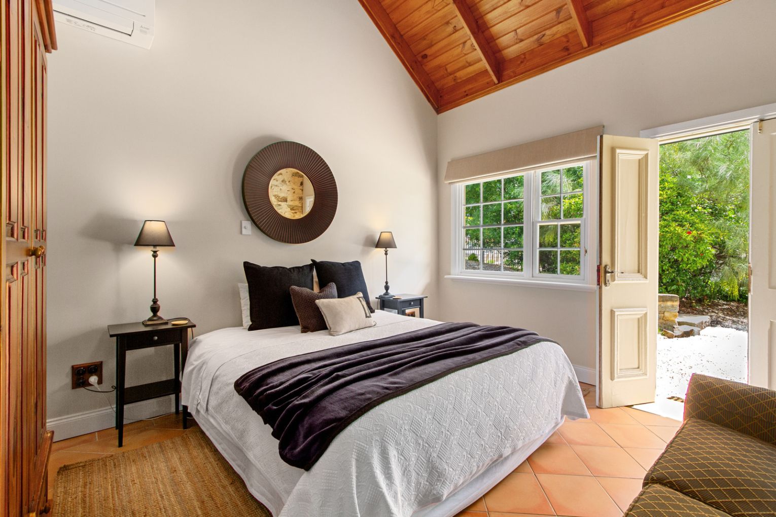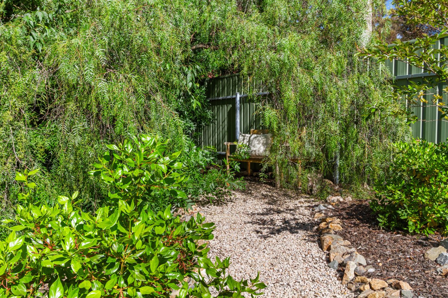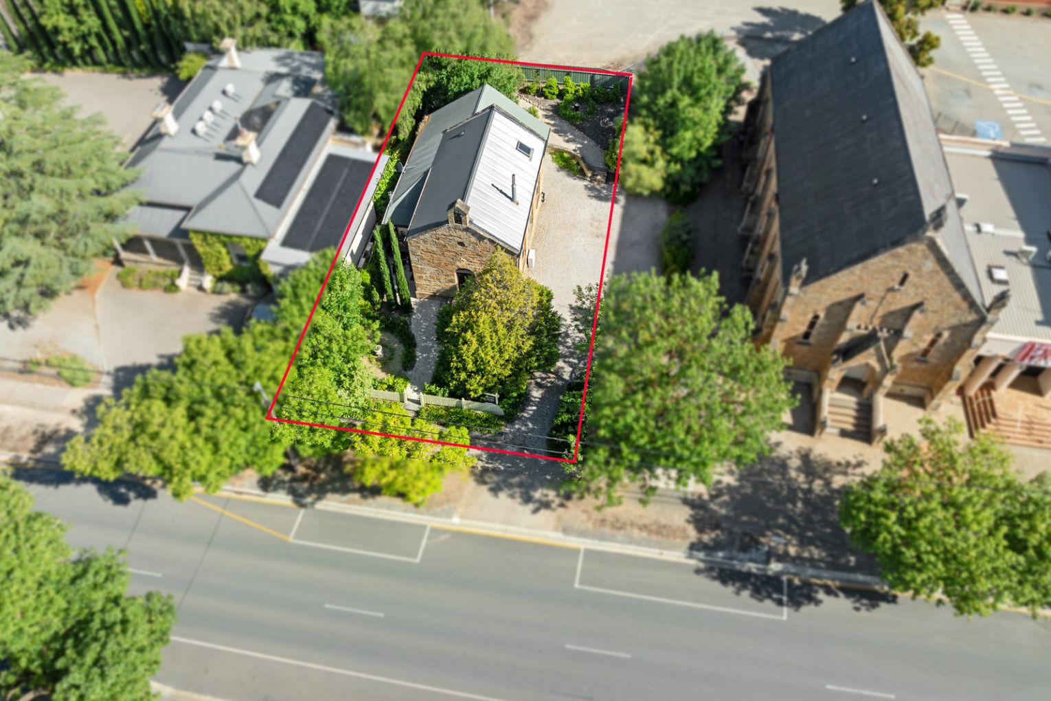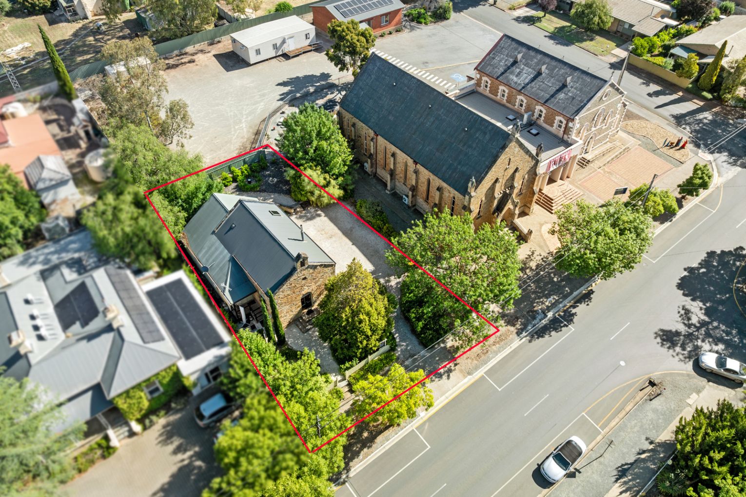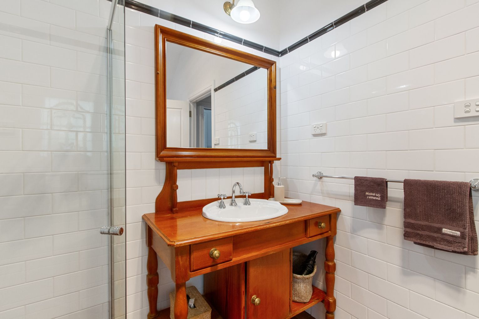 At the rear of the building, the second bedroom showcases exposed timber cathedral ceilings, handmade tiled floors, and the original, exposed stone back wall, enhanced by natural light filtering through a set of French doors. The downstairs area also includes a main bathroom with spa, separate shower, toilet, and a cleverly concealed laundry.