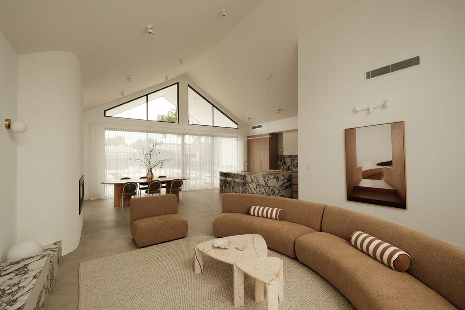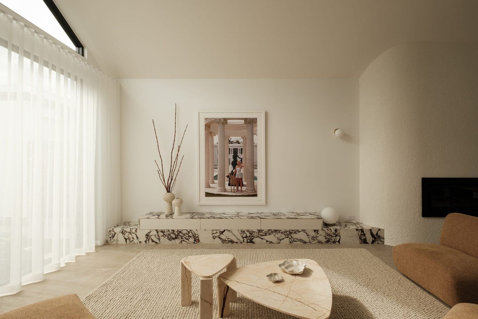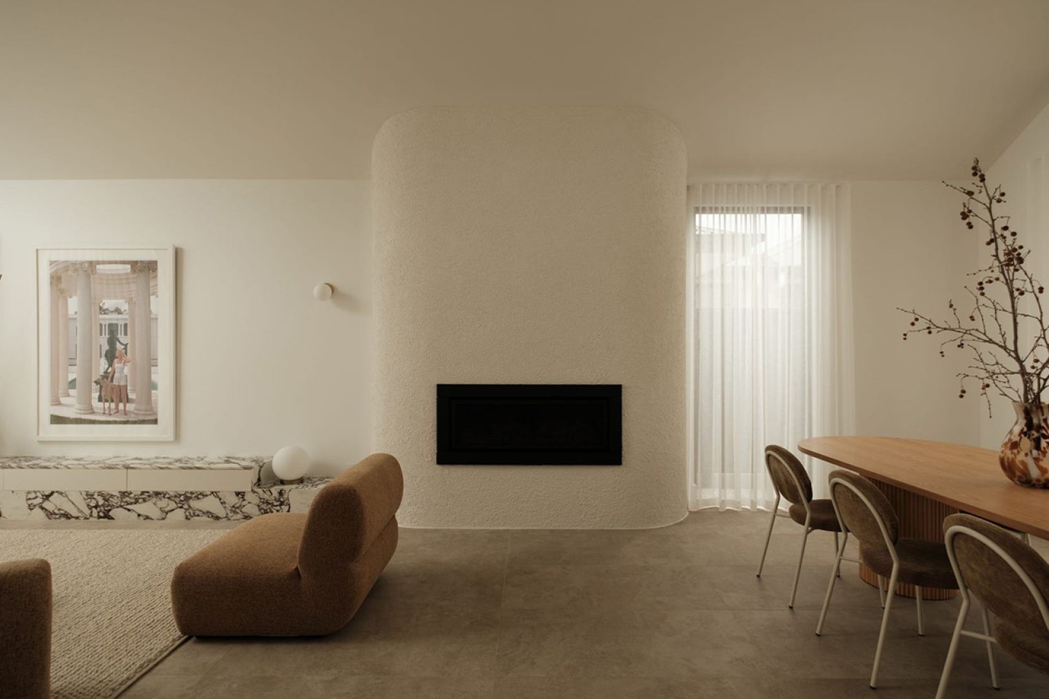 The curved, plaster-finished fireplace anchors the living space with sculptural elegance, while the breezeway corridor, flanked by serene garden pockets, bridges the home’s historic and contemporary wings with effortless grace.