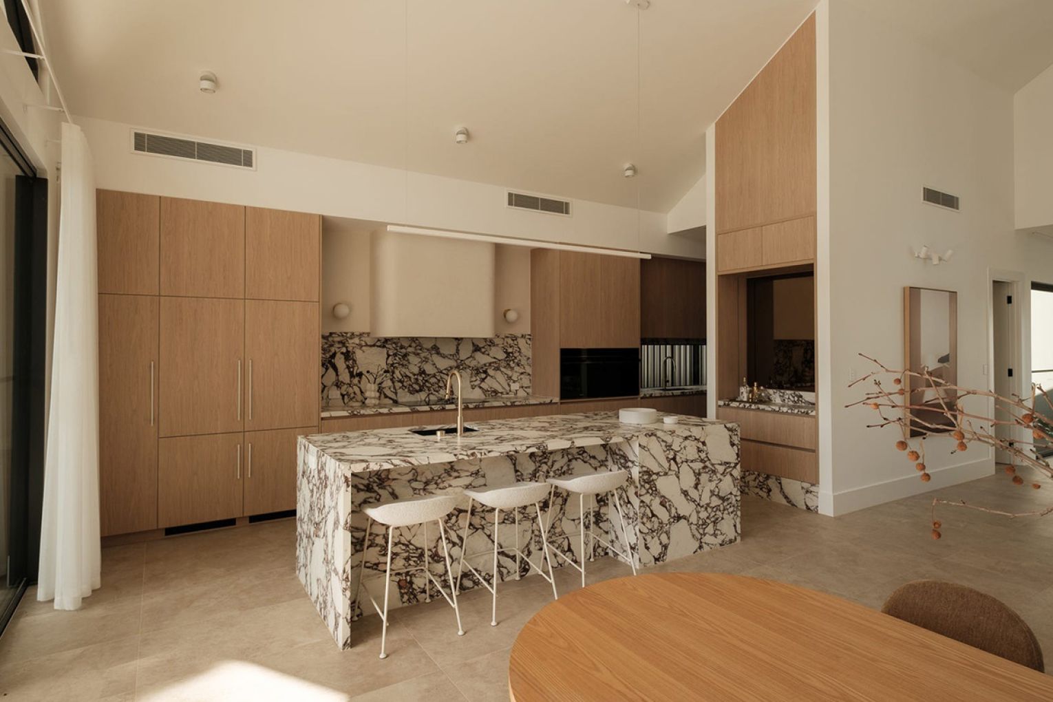 Calacutta Viola stone surfaces, chalk-white tones, pale oak herringbone flooring, and Venetian plaster finishes interplay in a symphony of light and texture.