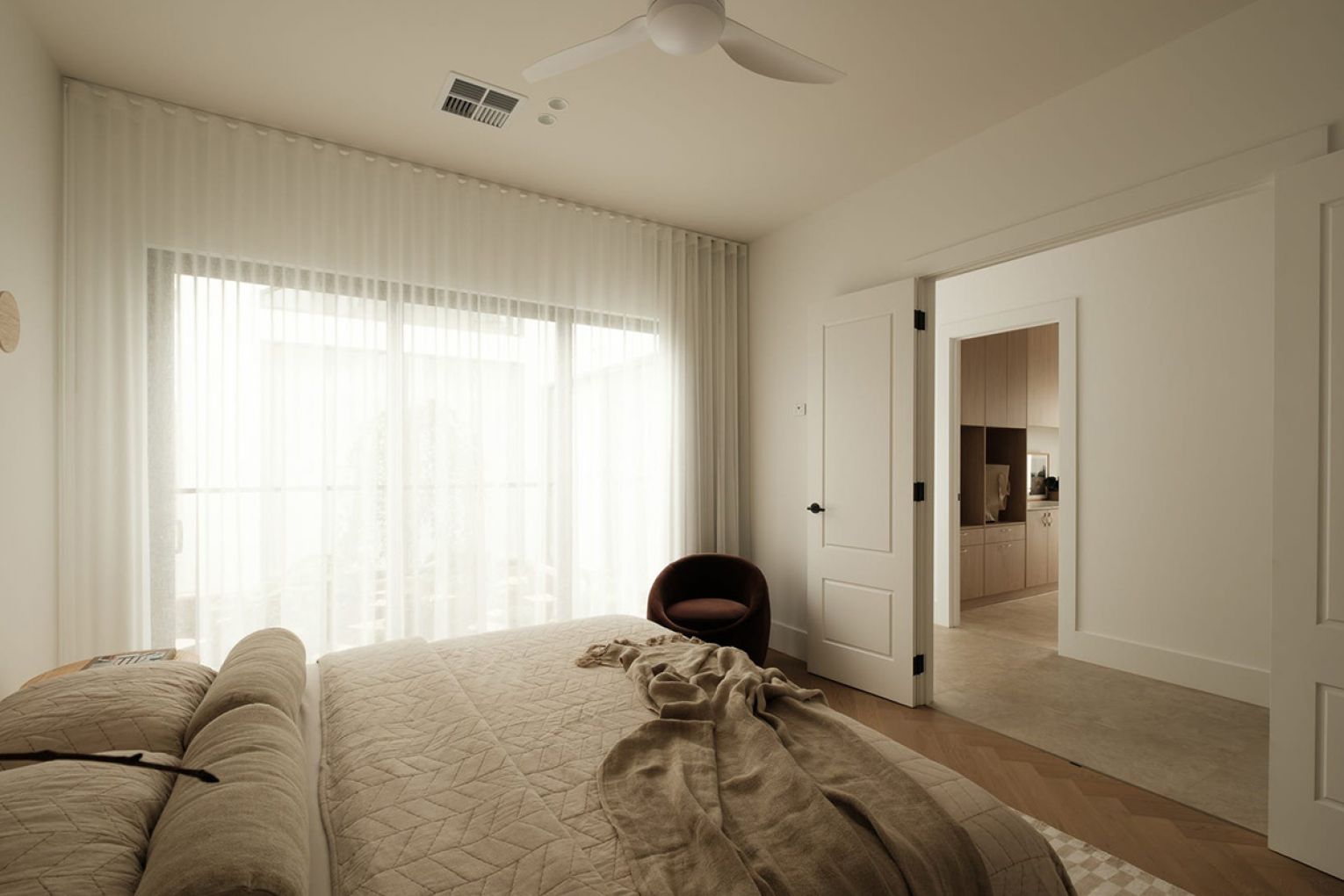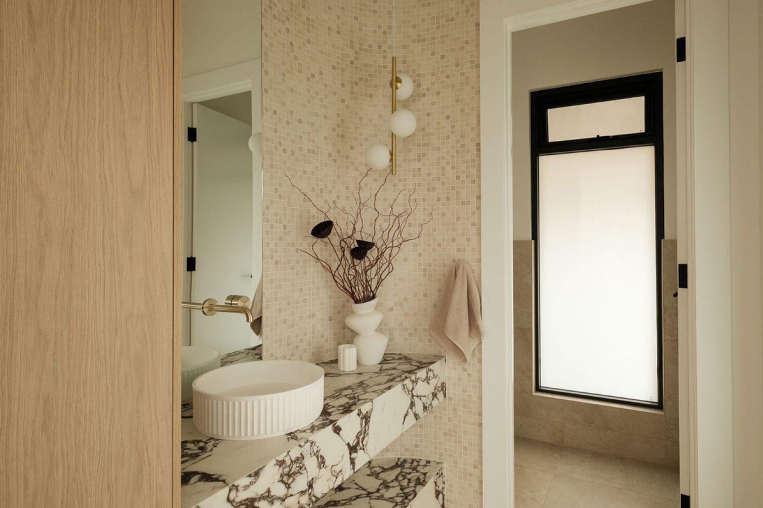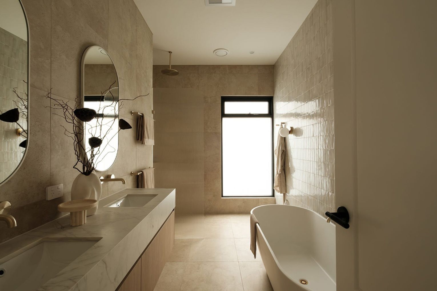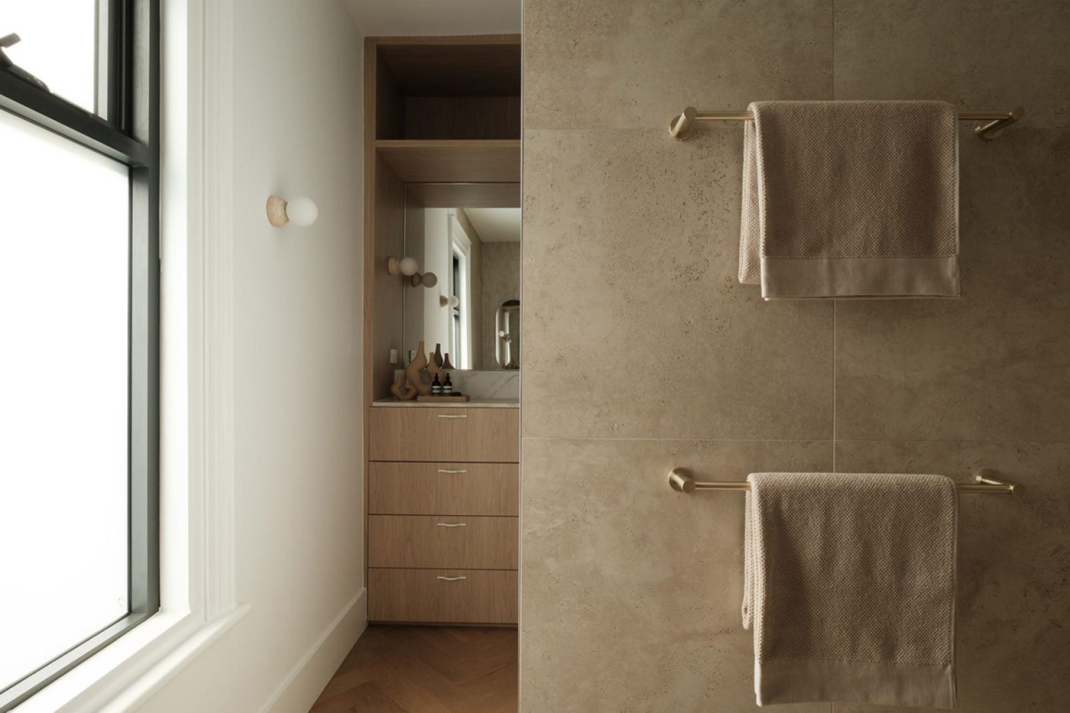 The primary suite is a private sanctuary, featuring a bespoke walk-in robe and a bronzed aesthetic ensuite of exceptional craftsmanship, complete with double shower heads and tactile designer finishes.