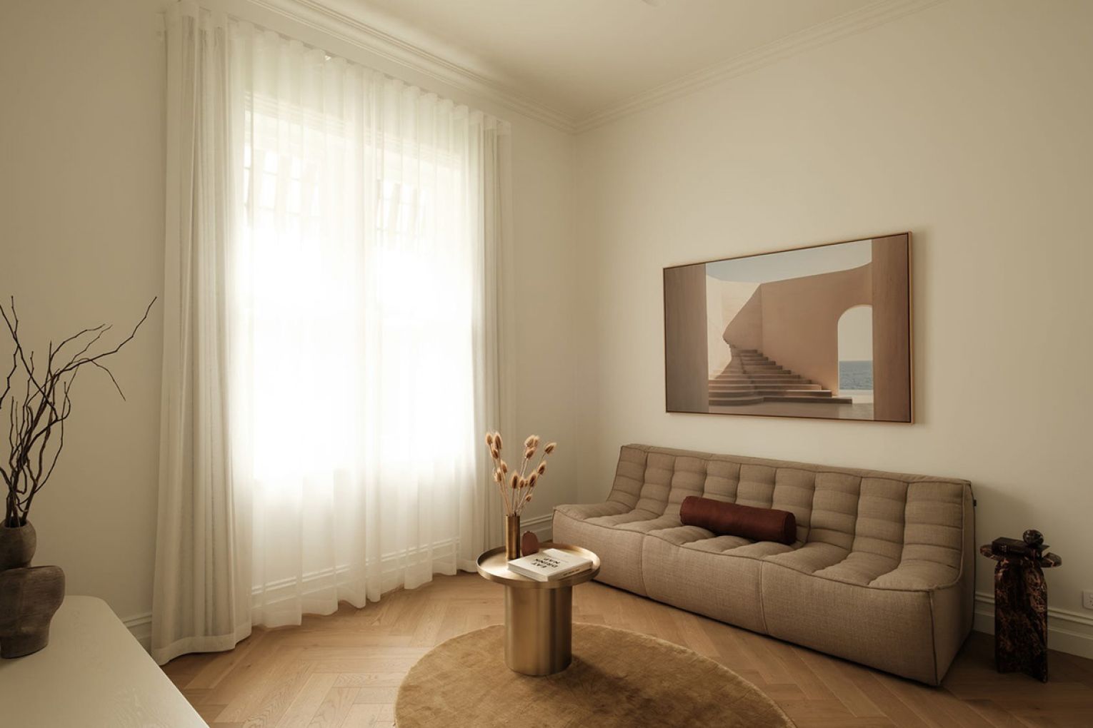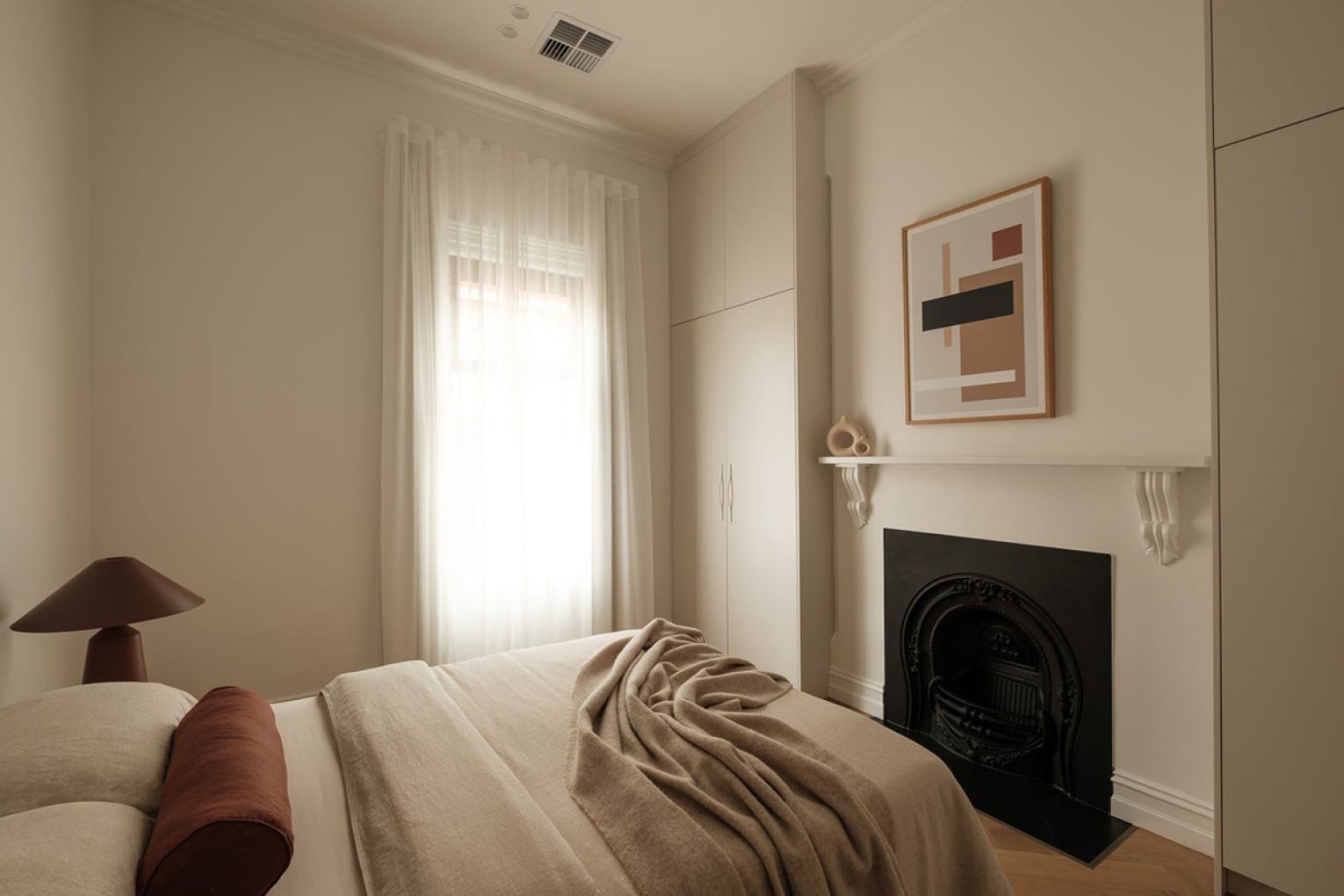 Original decorative fireplaces meet custom joinery in each bedroom, creating warmth and intimacy within the villa’s historic footprint.