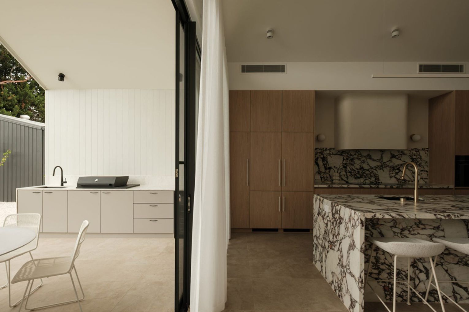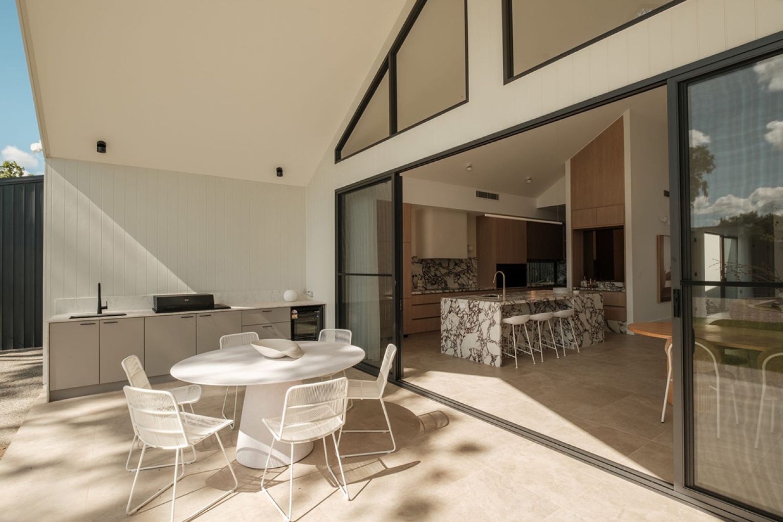 The all-seasons alfresco terrace, dressed in VJ panels and stone, is plumbed for year-round entertaining with an in-built BBQ and fully equipped outdoor kitchen.