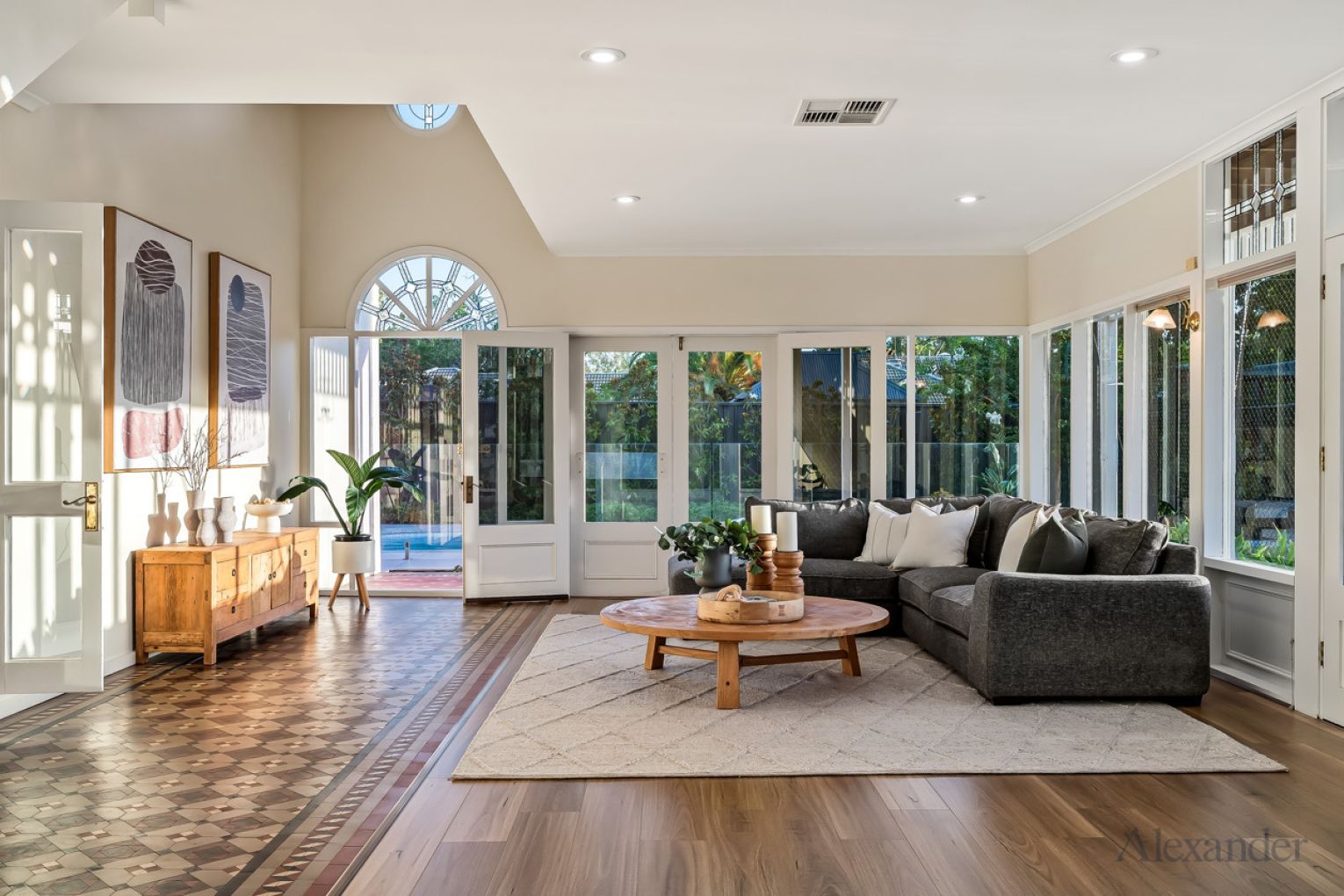 The expansive family room captures views from every angle. French doors open to the floodlit tennis court with a seating area, while opposite windows overlook the lagoon-style swimming pool. The room features heritage geometric encaustic tiles, leadlight accents, and full-height windows framing lush garden vistas, along with a storeroom, built-in cabinetry, an updated bathroom, and a combined laundry.