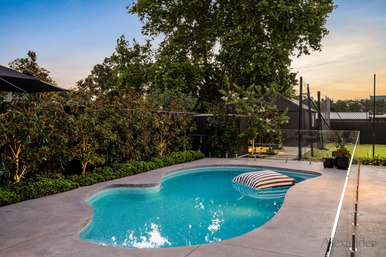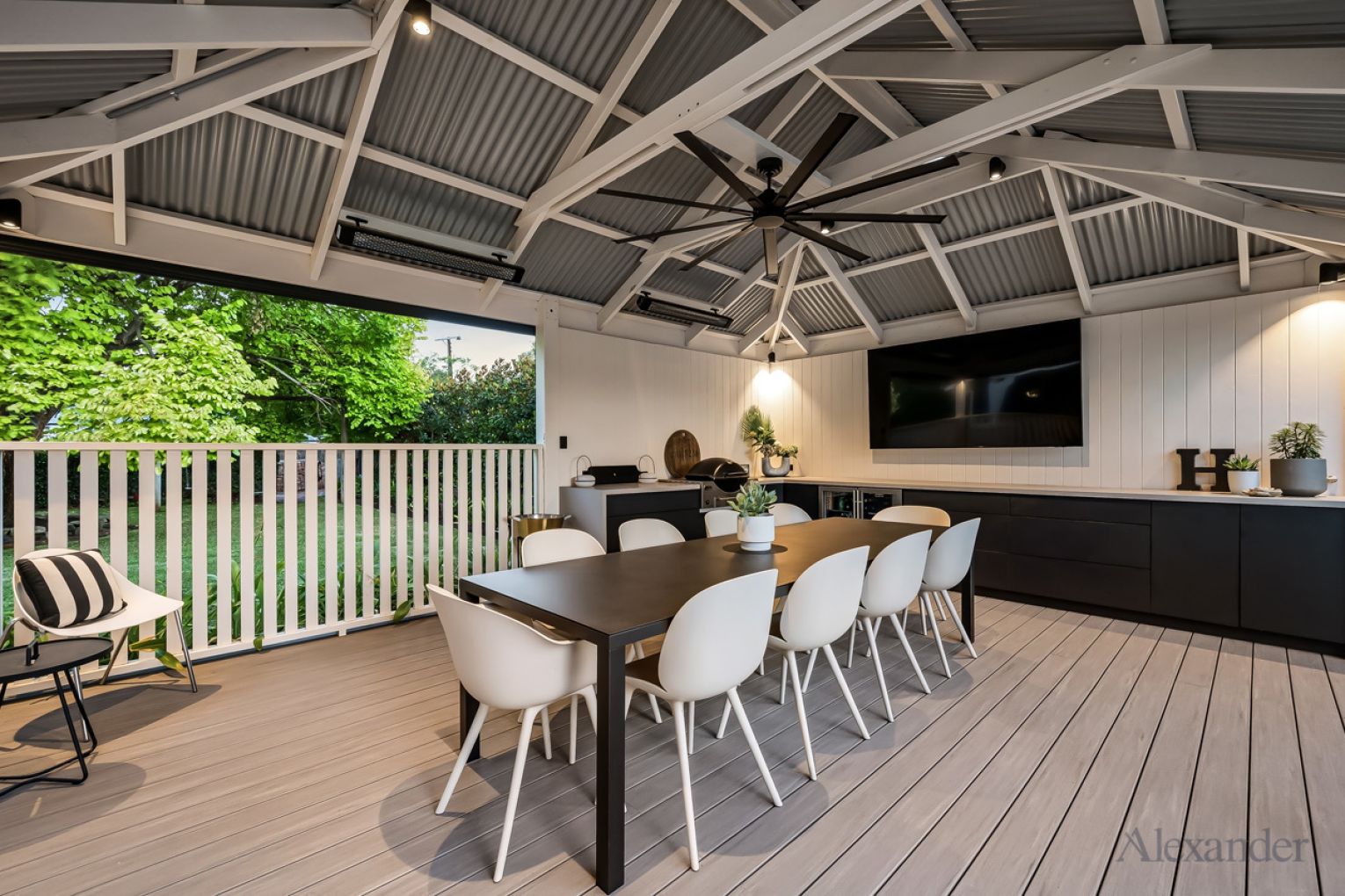 Outdoor living is exceptional. A spacious entertaining pavilion features a built-in BBQ, bar fridge, cabinetry, ceiling fans, café blinds and bar heaters, all overlooking the fully refurbished swimming pool with frameless glass fencing.