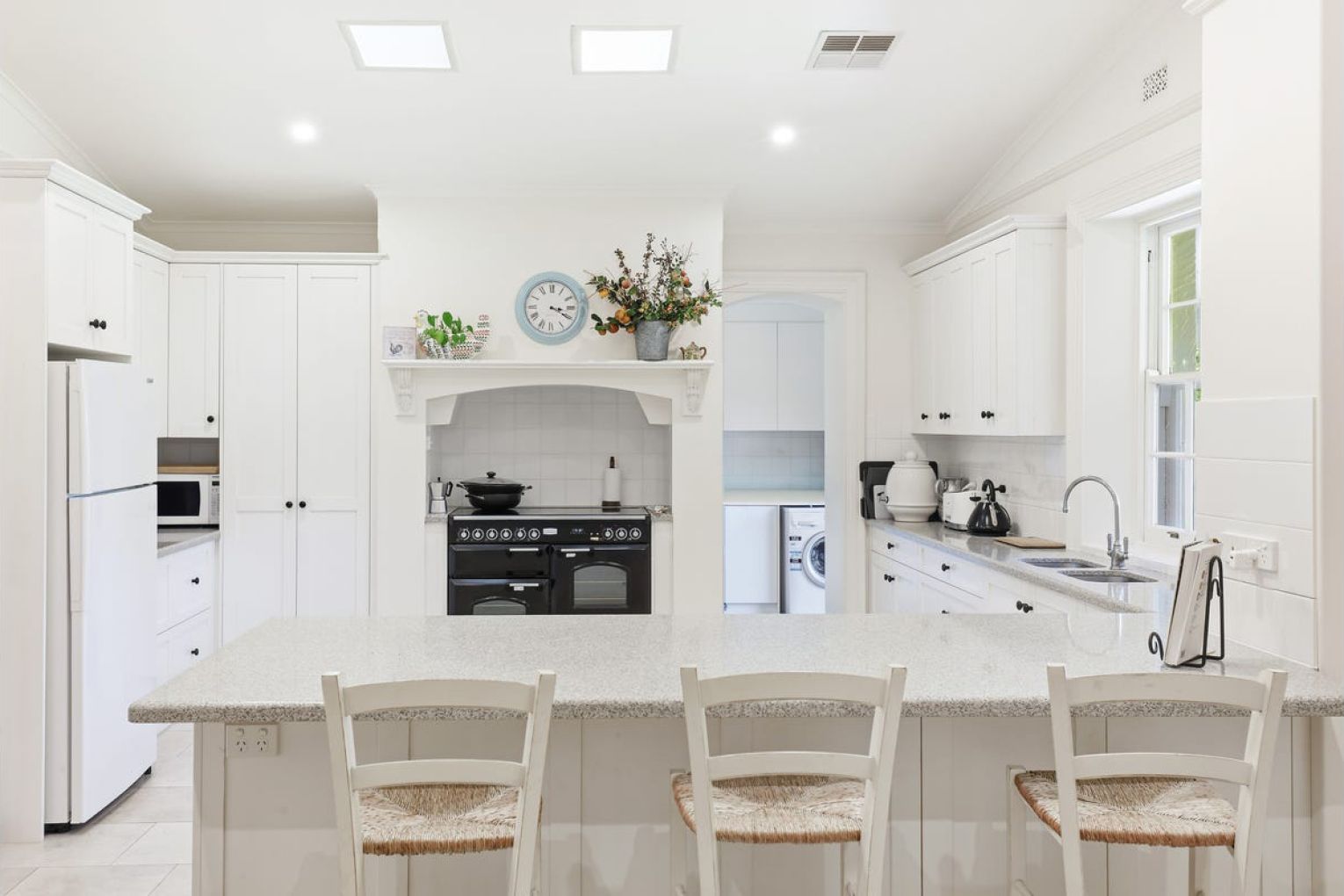 Inside, the home whispers refined country elegance. The centrepiece? A crisp white shaker-style kitchen with a Falcon cooker, beautifully finished and anchored by travertine floors that bring warmth, texture and a quiet luxury to daily life. It’s the kind of kitchen that makes cooking feel like a privilege – light, bright, and ready for long lunches, morning coffees and slow Sunday baking.