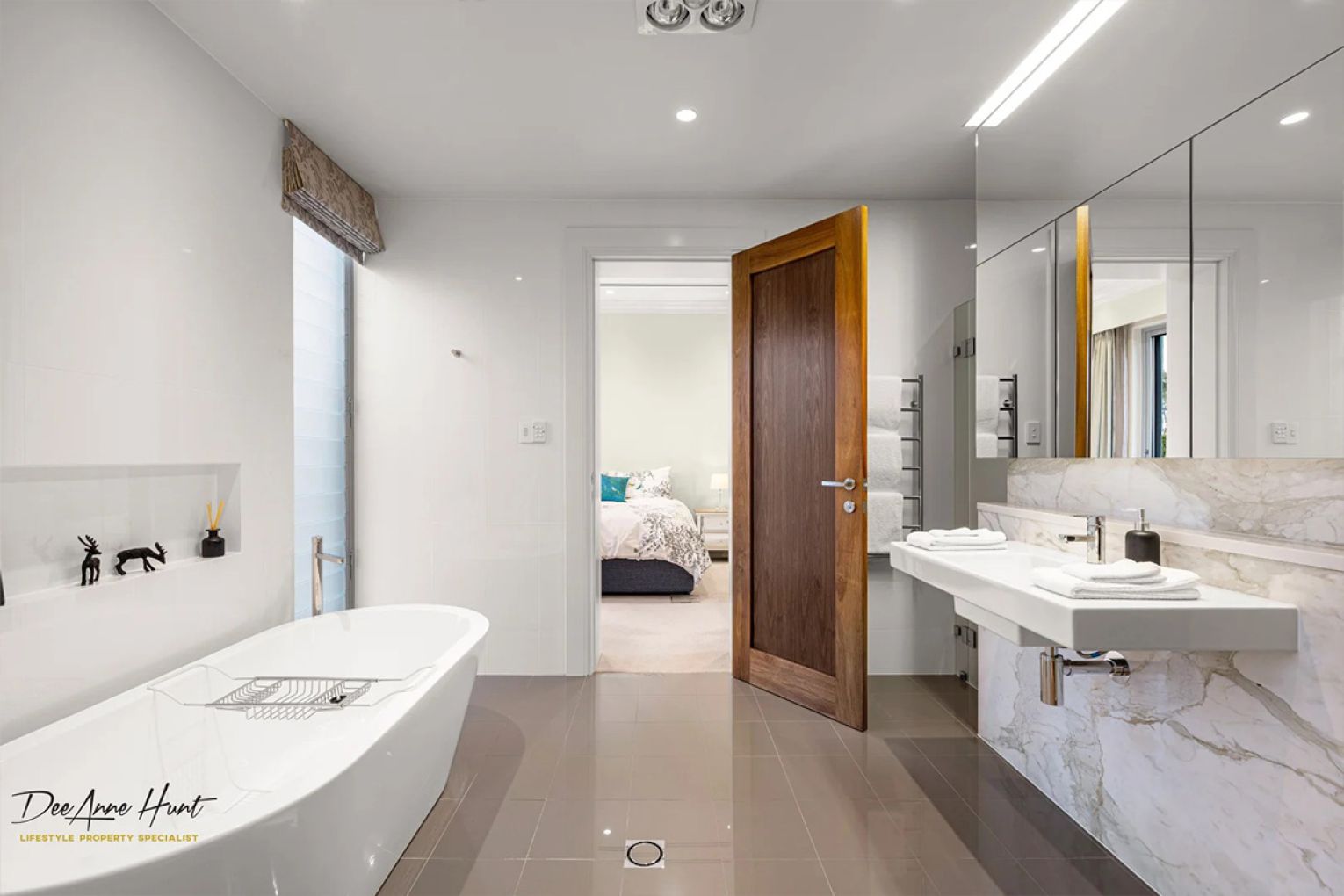 Sophisticated interiors let the landscape lead: Turkish marble floors, Tasmanian Blackwood doors, 3.5 luxe bathroom sanctuaries, and window furnishings you’ll never close are all crowned by ceilings reaching up to 3.4 metres.