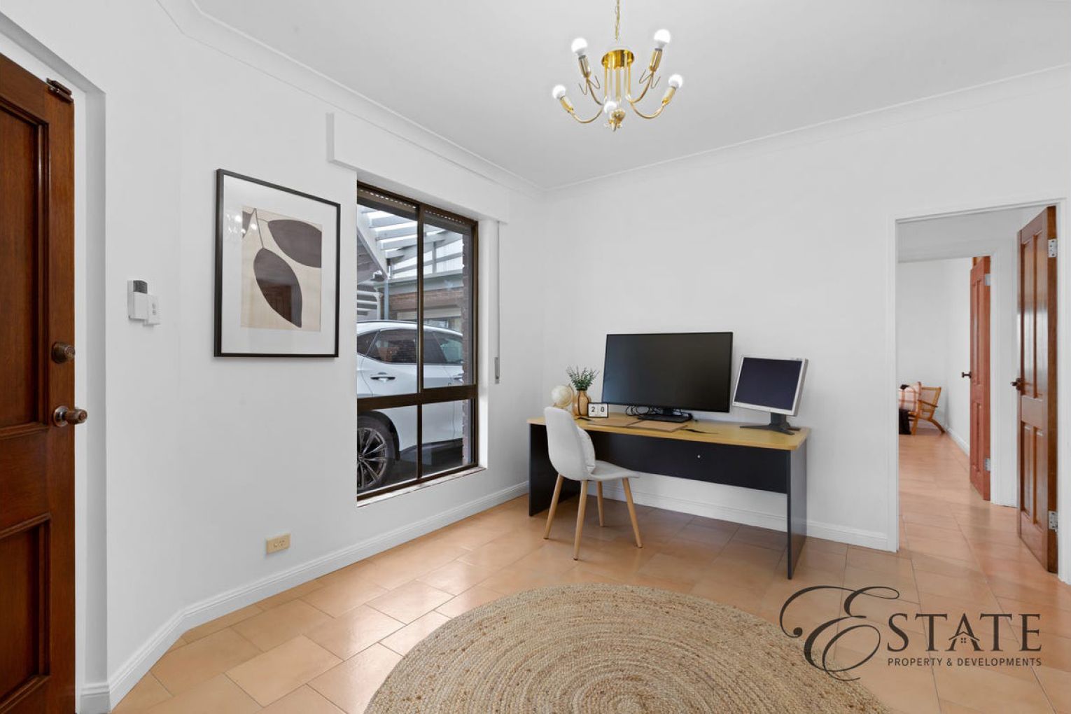 The central living domain is both elegant and inviting, anchored by a combustion fireplace and supported by ducted reverse-cycle air conditioning. A separate office with independent access creates an ideal executive workspace or consulting suite.